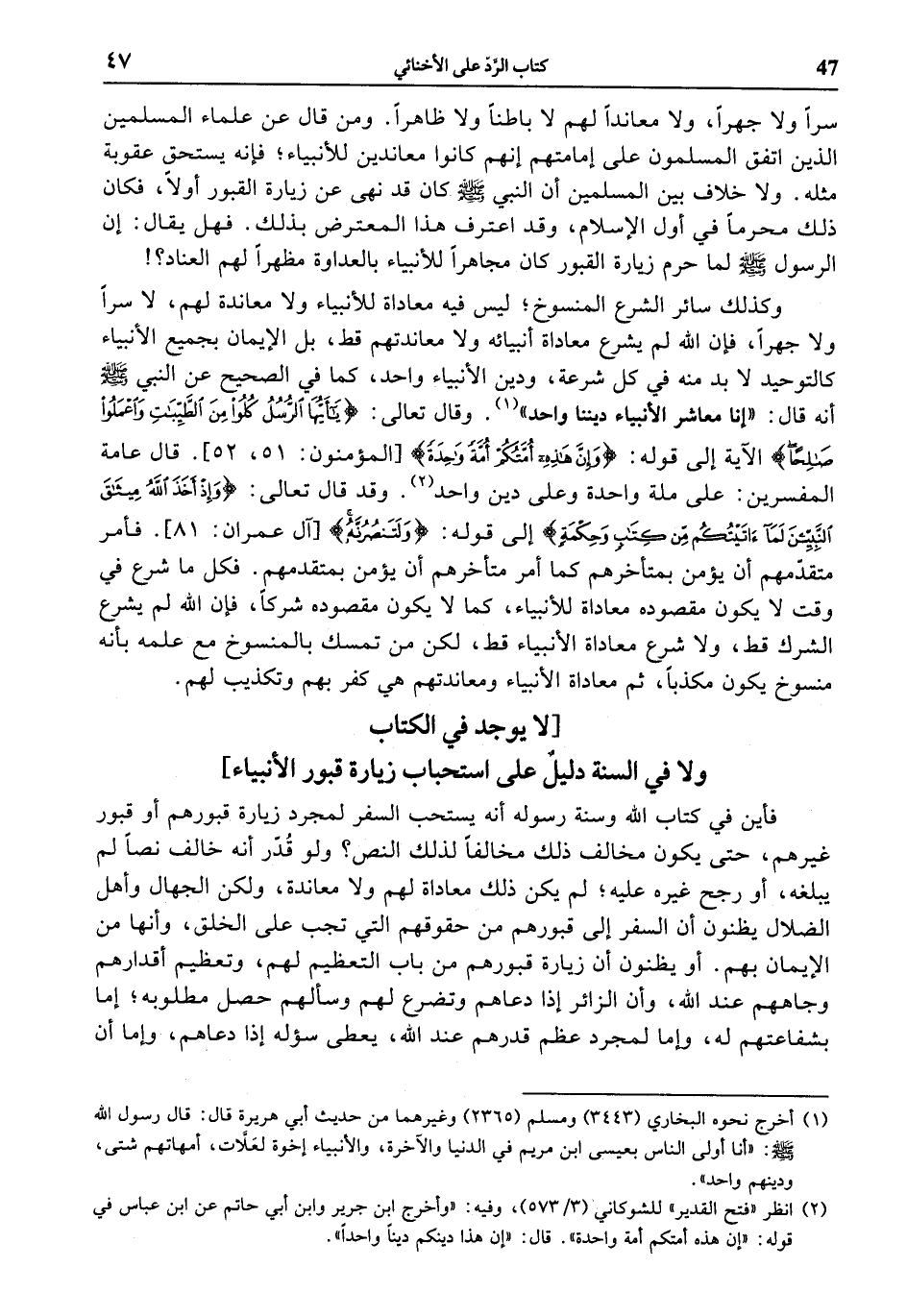 سرا ولا جهرا، ولا معاندا لهم لا باطنا ولا ظاهرا. ومن قال عن علماء المسلمين الذين اتفق المسلمون على إمامتهم إنهم كانوا معاندين للأنبياء؛ فإنه يستحق عقوبة مثله. ولا خلاف بين المسلمين أن النبي صلى الله عليه وسلّم كان قد نهى عن زيارة القبور أولا، فكان ذلك محرما في أول الإسلام، وقد اعترف هذا المعترض بذلك. فهل يقال: إن الرسول صلى الله عليه وسلّم لما حرم زيارة القبور كان مجاهرا للأنبياء بالعداوة مظهرا لهم العناد؟!