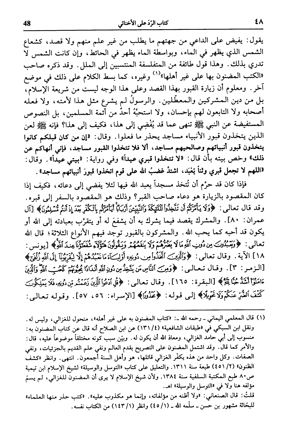 يقول: يفيض على الداعي من جهتهم ما يطلب من غير علم منهم ولا قصد، كشعاع الشمس الذي يظهر في الماء، وبواسطة الماء يظهر في الحائط، وإن كانت الشمس لا تدري بذلك. وهذا قول طائفة من المتفلسفة المنتسبين إلى الملل. وقد ذكره صاحب «الكتب المضنون بها على غير أهلها» «1» وغيره، كما بسط الكلام على ذلك في موضع آخر. ومعلوم أن زيارة القبور بهذا القصد وعلى هذا الوجه ليست من شريعة الإسلام، بل من دين المشركين والمعطّلين. والرسول لم يشرع مثل هذا لأمته، ولا فعله أصحابه ولا التابعون لهم بإحسان، ولا استحبّه أحد من أئمة المسلمين، بل النصوص المستفيضة عن النبي صلى الله عليه وسلّم تنهى عما قد يفضي إلى هذا، فكيف إلى هذا؟ فإنه صلى الله عليه وسلّم لعن الذين يتخذون قبور الأنبياء مساجد يحذر ما فعلوا. وقال: «إن من كان قبلكم كانوا يتخذون قبور أنبيائهم وصالحيهم مساجد، ألا فلا تتخذوا القبور مساجد، فإني أنهاكم عن ذلك» وخص بيته بأن قال: «لا تتخذوا قبري عيدا» وفي رواية: «بيتي عيدا». وقال: