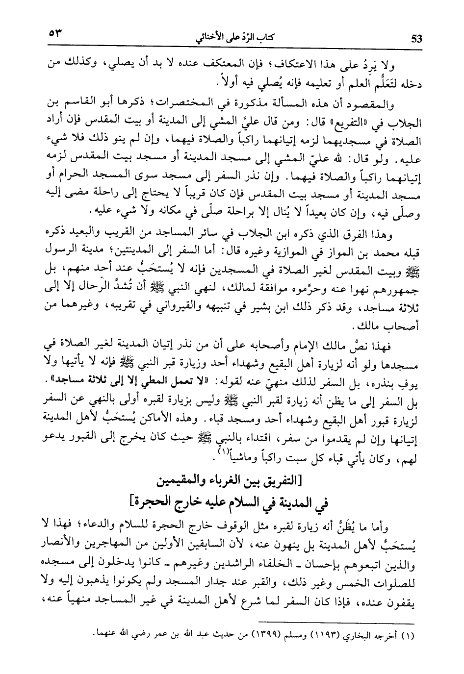 فهذا نصّ مالك الإمام وأصحابه على أن من نذر إتيان المدينة لغير الصلاة في مسجدها ولو أنه لزيارة أهل البقيع وشهداء أحد وزيارة قبر النبي صلى الله عليه وسلّم فإنه لا يأتيها ولا يوف بنذره، بل السفر لذلك منهيّ عنه لقوله: «لا تعمل المطي إلا إلى ثلاثة مساجد».