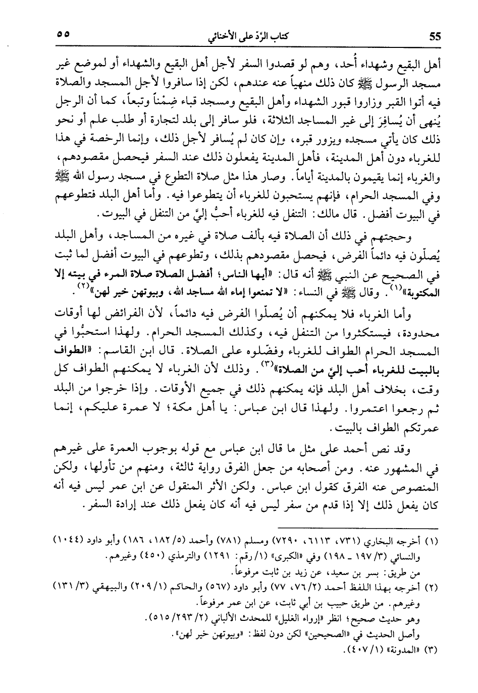 أهل البقيع وشهداء أحد، وهم لو قصدوا السفر لأجل أهل البقيع والشهداء أو لموضع غير مسجد الرسول صلى الله عليه وسلّم كان ذلك منهيا عنه عندهم، لكن إذا سافروا لأجل المسجد والصلاة فيه أتوا القبر وزاروا قبور الشهداء وأهل البقيع ومسجد قباء ضمنا وتبعا، كما أن الرجل ينهى أن يسافر إلى غير المساجد الثلاثة، فلو سافر إلى بلد لتجارة أو طلب علم أو نحو ذلك كان يأتي مسجده ويزور قبره، وإن كان لم يسافر لأجل ذلك، وإنما الرخصة في هذا للغرباء دون أهل المدينة، فأهل المدينة يفعلون ذلك عند السفر فيحصل مقصودهم، والغرباء إنما يقيمون بالمدينة أياما. وصار هذا مثل صلاة التطوع في مسجد رسول الله صلى الله عليه وسلّم وفي المسجد الحرام، فإنهم يستحبون للغرباء أن يتطوعوا فيه. وأما أهل البلد فتطوعهم في البيوت أفضل. قال مالك: التنفل فيه للغرباء أحبّ إليّ من التنفل في البيوت.
