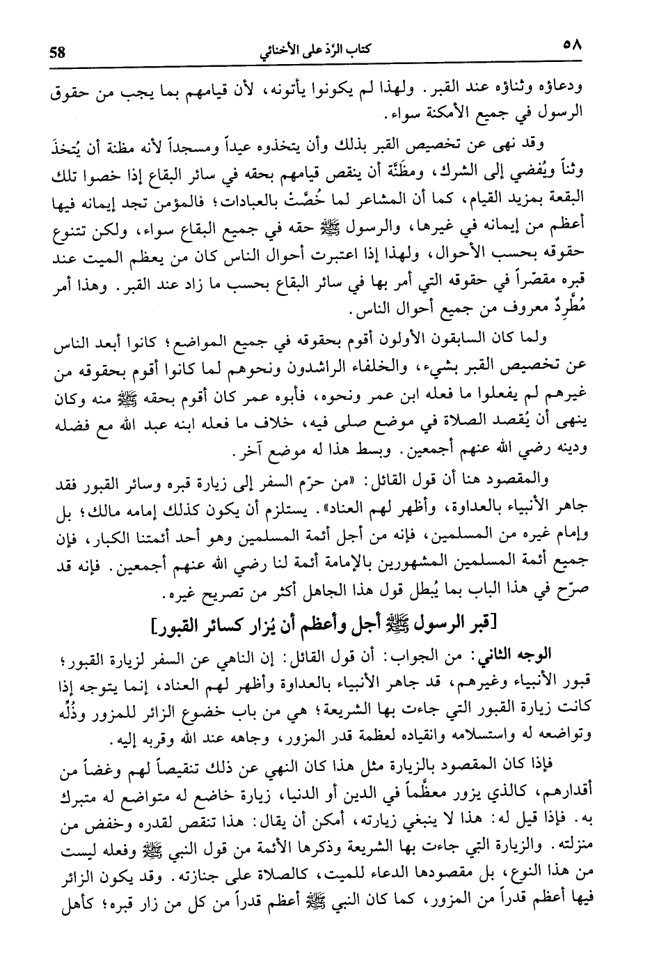 الوجه الثاني: من الجواب: أن قول القائل: إن الناهي عن السفر لزيارة القبور؛ قبور الأنبياء وغيرهم، قد جاهر الأنبياء بالعداوة وأظهر لهم العناد، إنما يتوجه إذا كانت زيارة القبور التي جاءت بها الشريعة؛ هي من باب خضوع الزائر للمزور وذلّه وتواضعه له واستسلامه وانقياده لعظمة قدر المزور، وجاهه عند الله وقربه إليه.