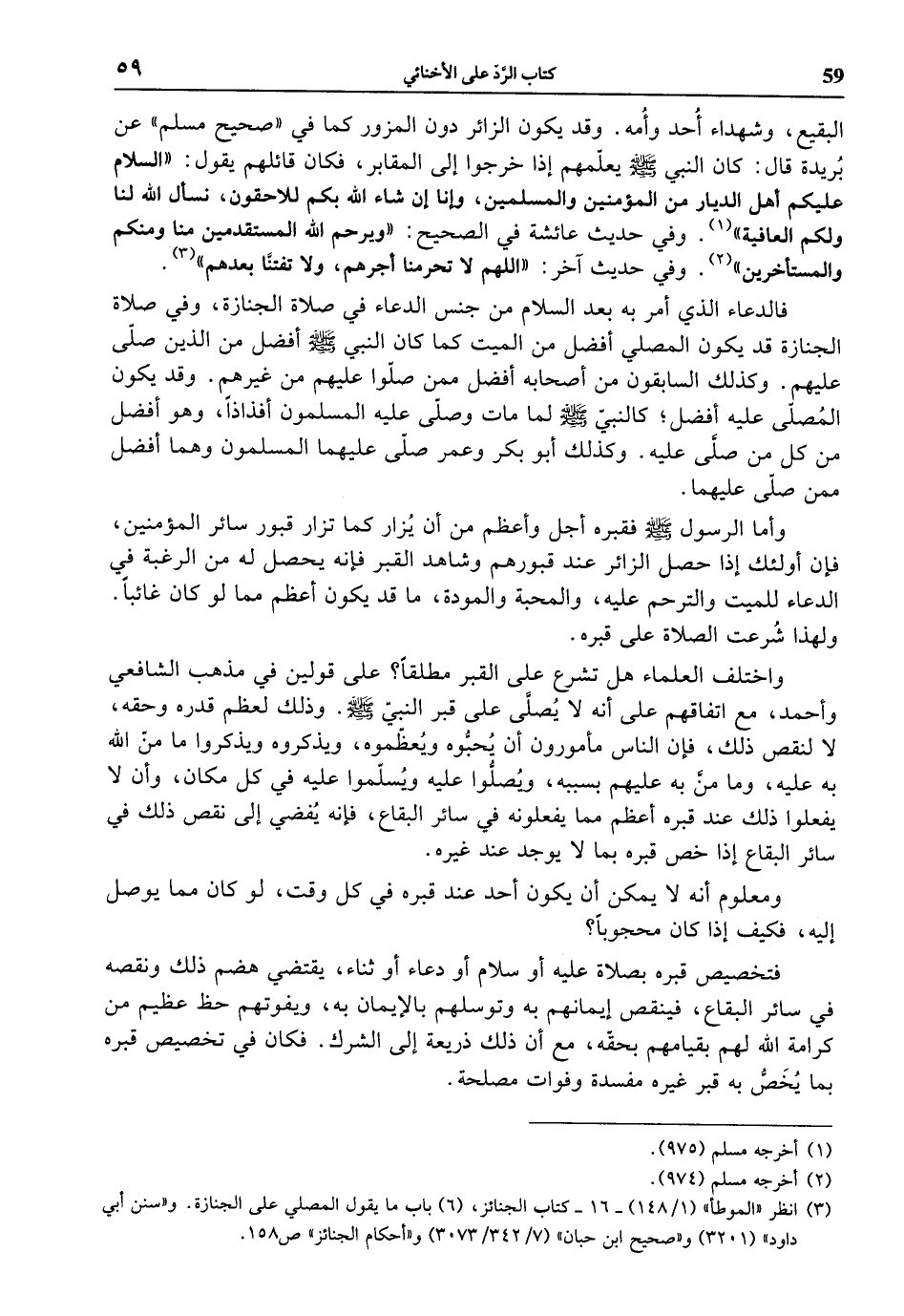 وأما الرسول صلى الله عليه وسلّم فقبره أجل وأعظم من أن يزار كما تزار قبور سائر المؤمنين، فإن أولئك إذا حصل الزائر عند قبورهم وشاهد القبر فإنه يحصل له من الرغبة في الدعاء للميت والترحم عليه، والمحبة والمودة، ما قد يكون أعظم مما لو كان غائبا.