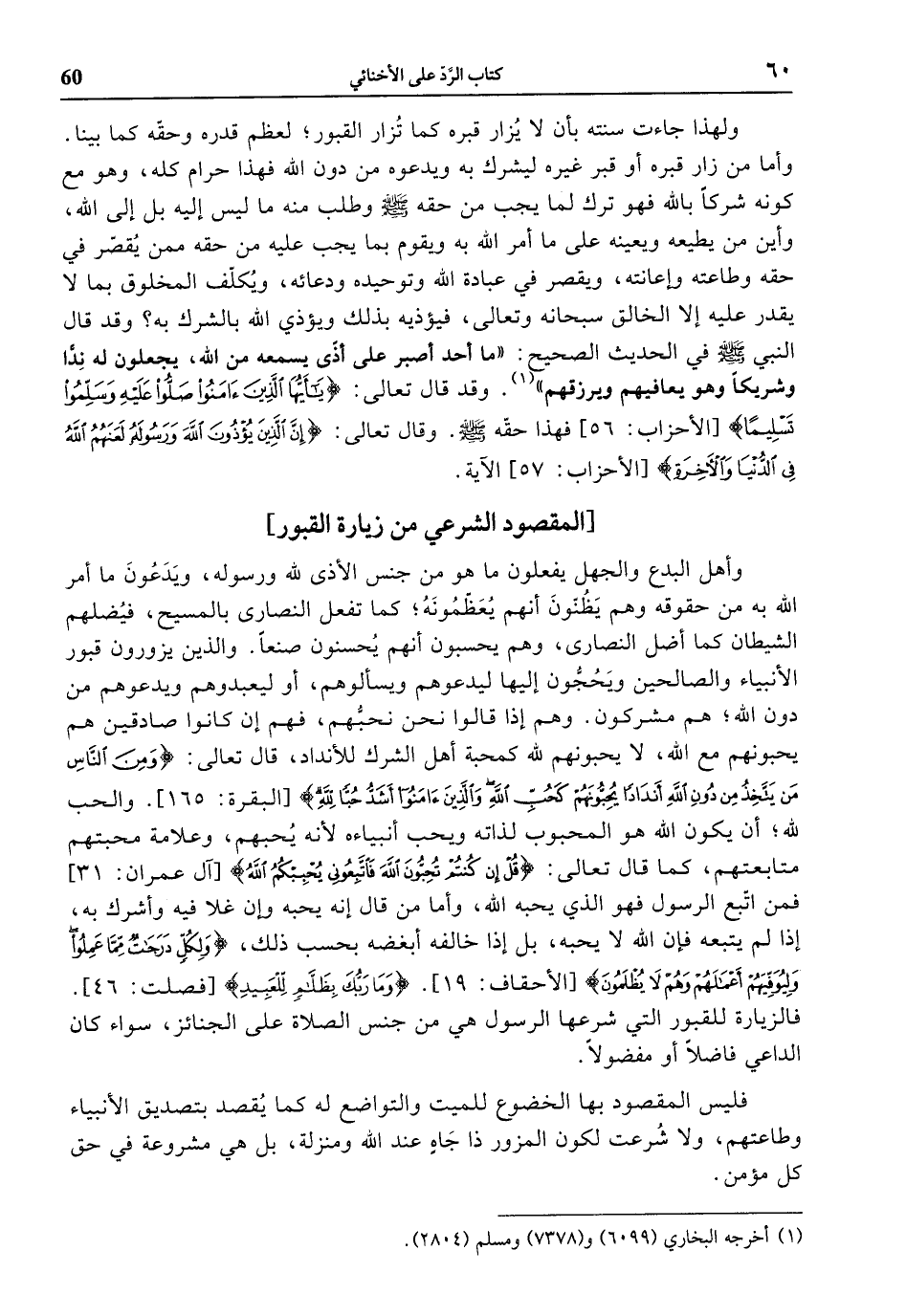 وأما من زار قبره أو قبر غيره ليشرك به ويدعوه من دون الله فهذا حرام كله، وهو مع كونه شركا بالله فهو ترك لما يجب من حقه صلى الله عليه وسلّم وطلب منه ما ليس إليه بل إلى الله، وأين من يطيعه ويعينه على ما أمر الله به ويقوم بما يجب عليه من حقه ممن يقصّر في حقه وطاعته وإعانته، ويقصر في عبادة الله وتوحيده ودعائه، ويكلّف المخلوق بما لا يقدر عليه إلا الخالق سبحانه وتعالى، فيؤذيه بذلك ويؤذي الله بالشرك به؟ وقد قال النبي صلى الله عليه وسلّم في الحديث الصحيح: «ما أحد أصبر على أذّى يسمعه من الله، يجعلون له ندّا وشريكا وهو يعافيهم ويرزقهم» «1». وقد قال تعالى: يا أَيُّهَا الَّذِينَ آمَنُوا صَلُّوا عَلَيْهِ وَسَلِّمُوا تَسْلِيماً [الأحزاب: 56] فهذا حقّه صلى الله عليه وسلّم. وقال تعالى: إِنَّ الَّذِينَ يُؤْذُونَ اللَّهَ وَرَسُولَهُ لَعَنَهُمُ اللَّهُ فِي الدُّنْيا وَالْآخِرَةِ [الأحزاب: 57] الآية.