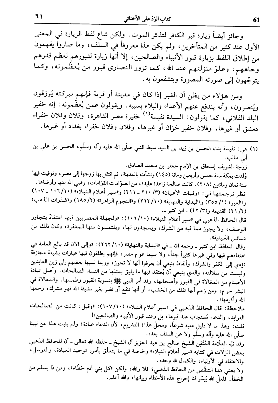 وقال الحافظ ابن كثير- رحمه الله- في «البداية والنهاية» (10/ 262): «وإلى الآن قد بالغ العامة في اعتقادهم فيها وفي غيرها كثيرا جدا، ولا سيما عوام مصر، فإنهم يطلقون فيها عبارات بشيعة مجازفة تؤدي إلى الكفر والشرك، وألفاظ ينبغي أن يعرفوا أنها لا تجوز، وربما نسبها بعضهم إلى زين العابدين وليست من سلالته، والذي ينبغي أن يعتقد فيها ما يليق بمثلها من النساء الصالحات. وأصل عبادة الأصنام من المغالاة في القبور وأصحابها، وقد أمر النبي صلى الله عليه وسلّم بتسوية القبور وطمسها. والمغالاة في البشر حرام، ومن زعم أنها تفك من الخشب، أو أنها تنفع أو تضر بغير مشيئة الله فهو مشرك، رحمها الله وأكرمها».