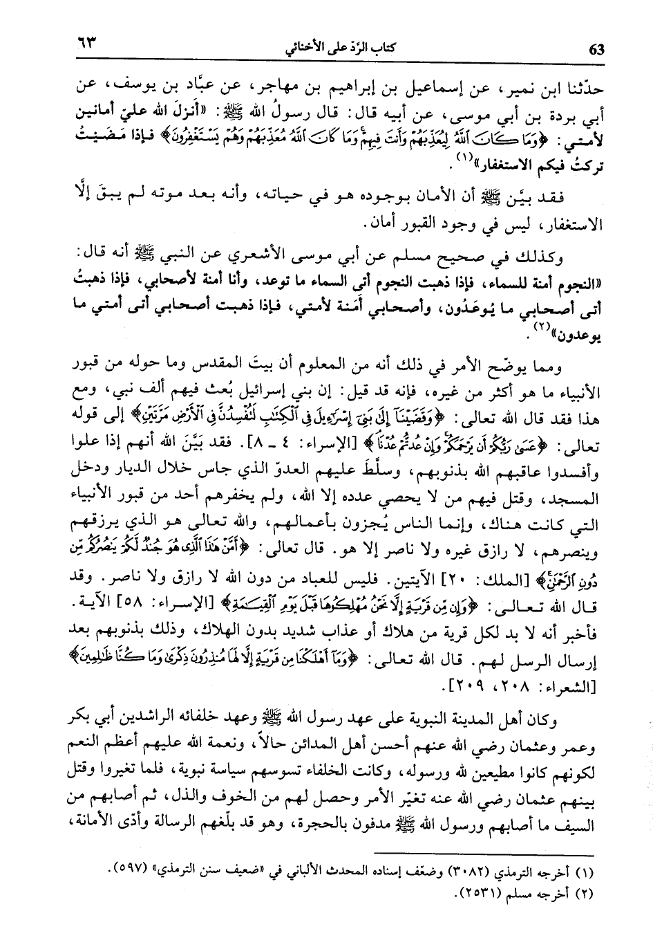 فقد بيّن صلى الله عليه وسلّم أن الأمان بوجوده هو في حياته، وأنه بعد موته لم يبق إلّا الاستغفار، ليس في وجود القبور أمان.