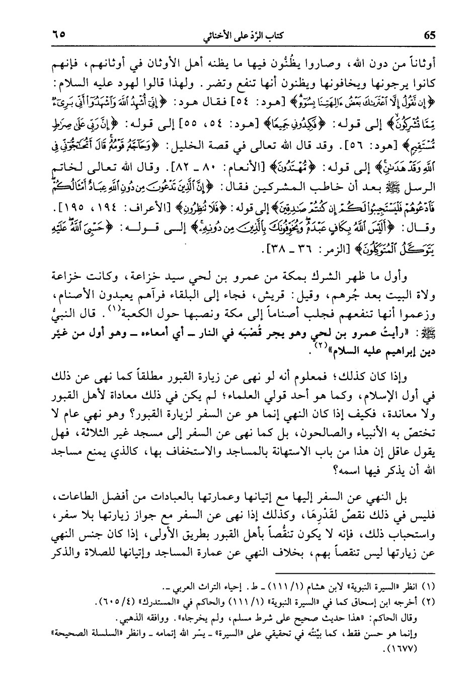 وإذا كان كذلك؛ فمعلوم أنه لو نهى عن زيارة القبور مطلقا كما نهى عن ذلك في أول الإسلام، وكما هو أحد قولي العلماء؛ لم يكن في ذلك معاداة لأهل القبور ولا معاندة، فكيف إذا كان النهي إنما هو عن السفر لزيارة القبور؟ وهو نهي عام لا تختصّ به الأنبياء والصالحون، بل كما نهى عن السفر إلى مسجد غير الثلاثة، فهل يقول عاقل إن هذا من باب الاستهانة بالمساجد والاستخفاف بها، كالذي يمنع مساجد الله أن يذكر فيها اسمه؟