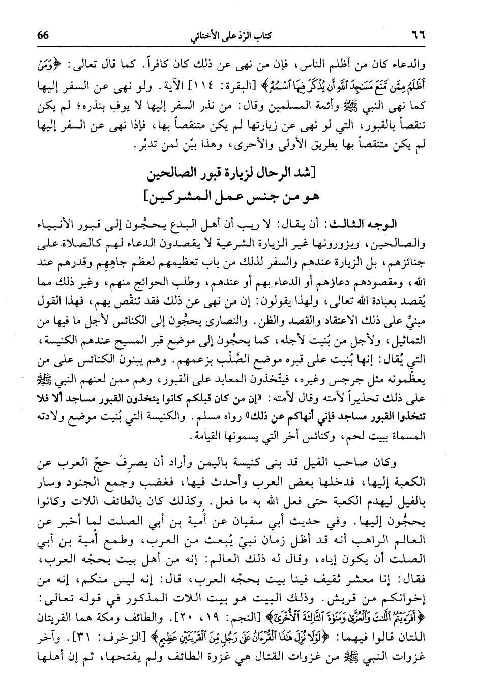 الوجه الثالث: أن يقال: لا ريب أن أهل البدع يحجّون إلى قبور الأنبياء والصالحين، ويزورونها غير الزيارة الشرعية لا يقصدون الدعاء لهم كالصلاة على جنائزهم، بل الزيارة عندهم والسفر لذلك من باب تعظيمهم لعظم جاههم وقدرهم عند الله، ومقصودهم دعاؤهم أو الدعاء بهم أو عندهم، وطلب الحوائج منهم، وغير ذلك مما يقصد بعبادة الله تعالى، ولهذا يقولون: إن من نهى عن ذلك فقد تنقّص بهم، فهذا القول مبنيّ على ذلك الاعتقاد والقصد والظن. والنصارى يحجّون إلى الكنائس لأجل ما فيها من التماثيل، ولأجل من بنيت لأجله، كما يحجّون إلى موضع قبر المسيح عندهم الكنيسة، التي يقال: إنها بنيت على قبره موضع الصّلب بزعمهم. وهم يبنون الكنائس على من يعظّمونه مثل جرجس وغيره، فيتّخذون المعابد على القبور، وهم ممن لعنهم النبي صلى الله عليه وسلّم على ذلك تحذيرا لأمته وقال لأمته: «إن من كان قبلكم كانوا يتخذون القبور مساجد ألا فلا تتخذوا القبور مساجد فإني أنهاكم عن ذلك» رواه مسلم. والكنيسة التي بنيت موضع ولادته المسماة ببيت لحم، وكنائس أخر التي يسمونها القيامة.