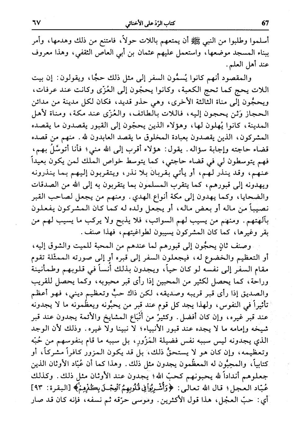 والمقصود أنهم كانوا يسمّون السفر إلى مثل ذلك حجّا، ويقولون: إن بيت اللات يحج كما تحج الكعبة، وكانوا يحجّون إلى العزّى وكانت عند عرفات، ويحجّون إلى مناة الثالثة الأخرى، وهي حذو قديد، فكان لكل مدينة من مدائن الحجاز وثن يحجون إليه، فاللات بالطائف، والعزّى عند مكة، ومناة لأهل المدينة، كانوا يهلون لها، وهؤلاء الذين يحجّون إلى القبور يقصدون ما يقصده المشركون، الذين يقصدون بعبادة المخلوق ما يقصد العابدون لله. منهم من قصده قضاء حاجته وإجابة سؤاله. يقول: هؤلاء أقرب إلى الله مني؛ فأنا أتوسّل بهم، فهم يتوسطون لي في قضاء حاجتي، كما يتوسط خواص الملك لمن يكون بعيدا عنهم، وقد ينذر لهم، أو يأتي بقربان بلا نذر، ويتقربون إليهم بما ينذرونه ويهدونه إلى قبورهم، كما يتقرب المسلمون بما يتقربون به إلى الله من الصدقات والضحايا، وكما يهدون إلى مكة أنواع الهدي. ومنهم من يجعل لصاحب القبر نصيبا من ماله أو بعض ماله، أو يجعل ولده له كما كان المشركون يفعلون بآلهتهم. ومنهم من يسيب لهم السوائب، فلا يذبح ولا يركب ما يسيب لهم من بقر وغيرها، كما كان المشركون يسيبون لطواغيتهم، فهذا صنف.