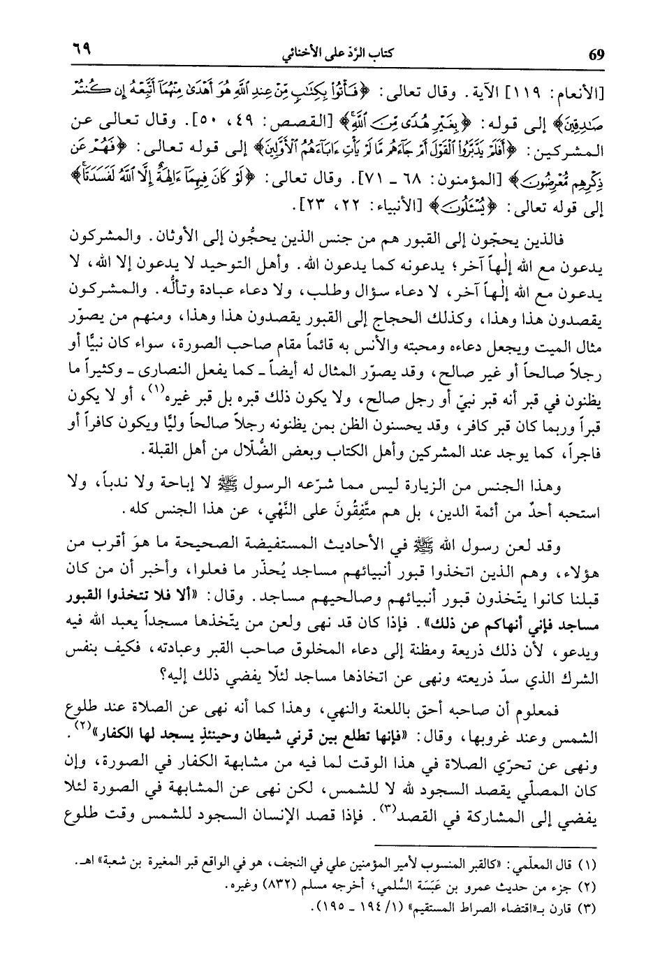 وقد لعن رسول الله صلى الله عليه وسلّم في الأحاديث المستفيضة الصحيحة ما هو أقرب من هؤلاء، وهم الذين اتخذوا قبور أنبيائهم مساجد يحذّر ما فعلوا، وأخبر أن من كان قبلنا كانوا يتّخذون قبور أنبيائهم وصالحيهم مساجد. وقال: «ألا فلا تتخذوا القبور مساجد فإني أنهاكم عن ذلك». فإذا كان قد نهى ولعن من يتّخذها مسجدا يعبد الله فيه ويدعو، لأن ذلك ذريعة ومظنة إلى دعاء المخلوق صاحب القبر وعبادته، فكيف بنفس الشرك الذي سدّ ذريعته ونهى عن اتخاذها مساجد لئلّا يفضي ذلك إليه؟