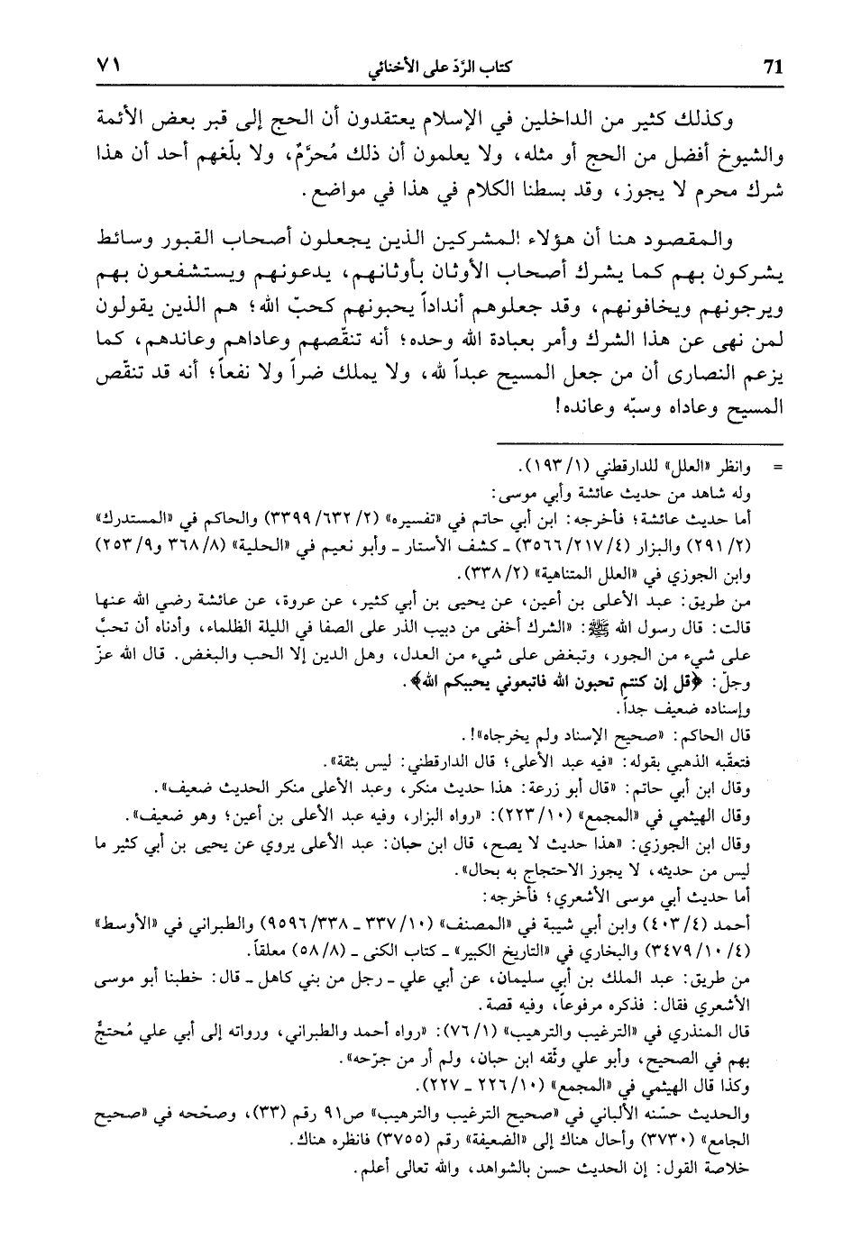 وكذلك كثير من الداخلين في الإسلام يعتقدون أن الحج إلى قبر بعض الأئمة والشيوخ أفضل من الحج أو مثله، ولا يعلمون أن ذلك محرّم، ولا بلّغهم أحد أن هذا شرك محرم لا يجوز، وقد بسطنا الكلام في هذا في مواضع.