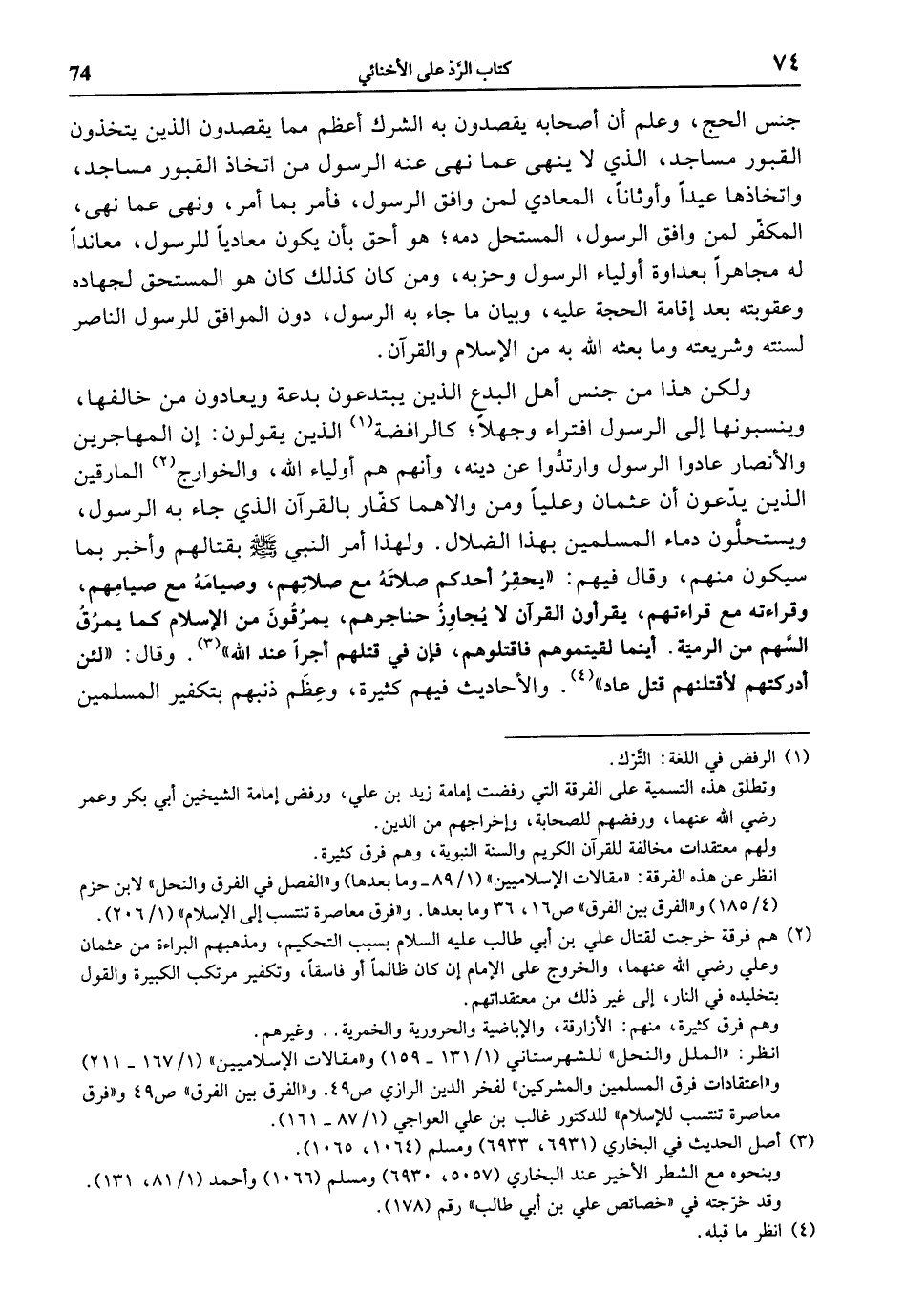 جنس الحج، وعلم أن أصحابه يقصدون به الشرك أعظم مما يقصدون الذين يتخذون القبور مساجد، الذي لا ينهى عما نهى عنه الرسول من اتخاذ القبور مساجد، واتخاذها عيدا وأوثانا، المعادي لمن وافق الرسول، فأمر بما أمر، ونهى عما نهى، المكفّر لمن وافق الرسول، المستحل دمه؛ هو أحق بأن يكون معاديا للرسول، معاندا له مجاهرا بعداوة أولياء الرسول وحزبه، ومن كان كذلك كان هو المستحق لجهاده وعقوبته بعد إقامة الحجة عليه، وبيان ما جاء به الرسول، دون الموافق للرسول الناصر لسنته وشريعته وما بعثه الله به من الإسلام والقرآن.