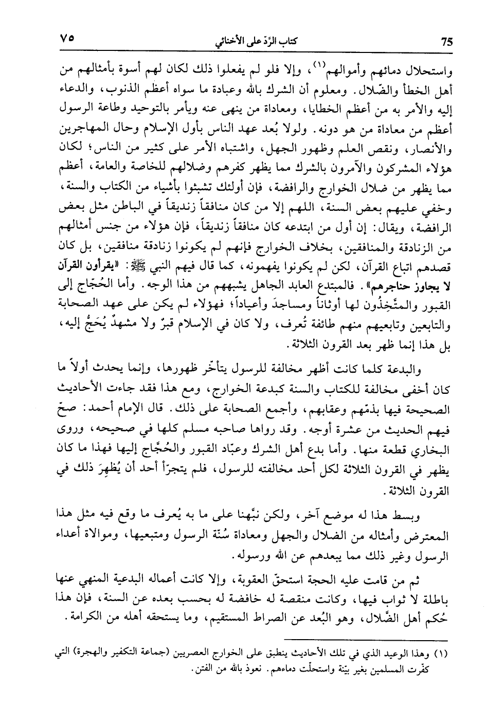 (1) وهذا الوعيد الذي في تلك الأحاديث ينطبق على الخوارج العصريين (جماعة التكفير والهجرة) التي كفّرت المسلمين بغير بيّنة واستحلّت دماءهم. نعوذ بالله من الفتن.
