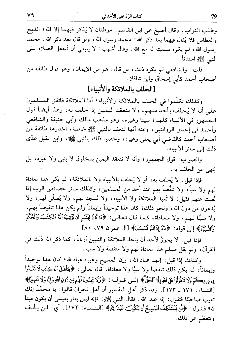 فإذا قيل: لا يحلف به، أو لا يحلف بالأنبياء ولا بالملائكة؛ لم يكن هذا معاداة لهم ولا سبا، ولا تنقّصا بهم عند أحد من المسلمين، وكذلك سائر خصائص الرب إذا نفيت عنهم فقيل: لا تعبد الملائكة ولا الأنبياء، ولا يسجد لهم، ولا يصلّى لهم، ولا يدعون من دون الله، ونحو ذلك؛ كان هذا توحيدا وإيمانا ولم يكن هذا تنقيصا بهم، ولا سبّا لهم، ولا معاداة، كما قال تعالى: ما كانَ لِبَشَرٍ أَنْ يُؤْتِيَهُ اللَّهُ الْكِتابَ وَالْحُكْمَ وَالنُّبُوَّةَ إلى قوله: بَعْدَ إِذْ أَنْتُمْ مُسْلِمُونَ [آل عمران 79، 80].