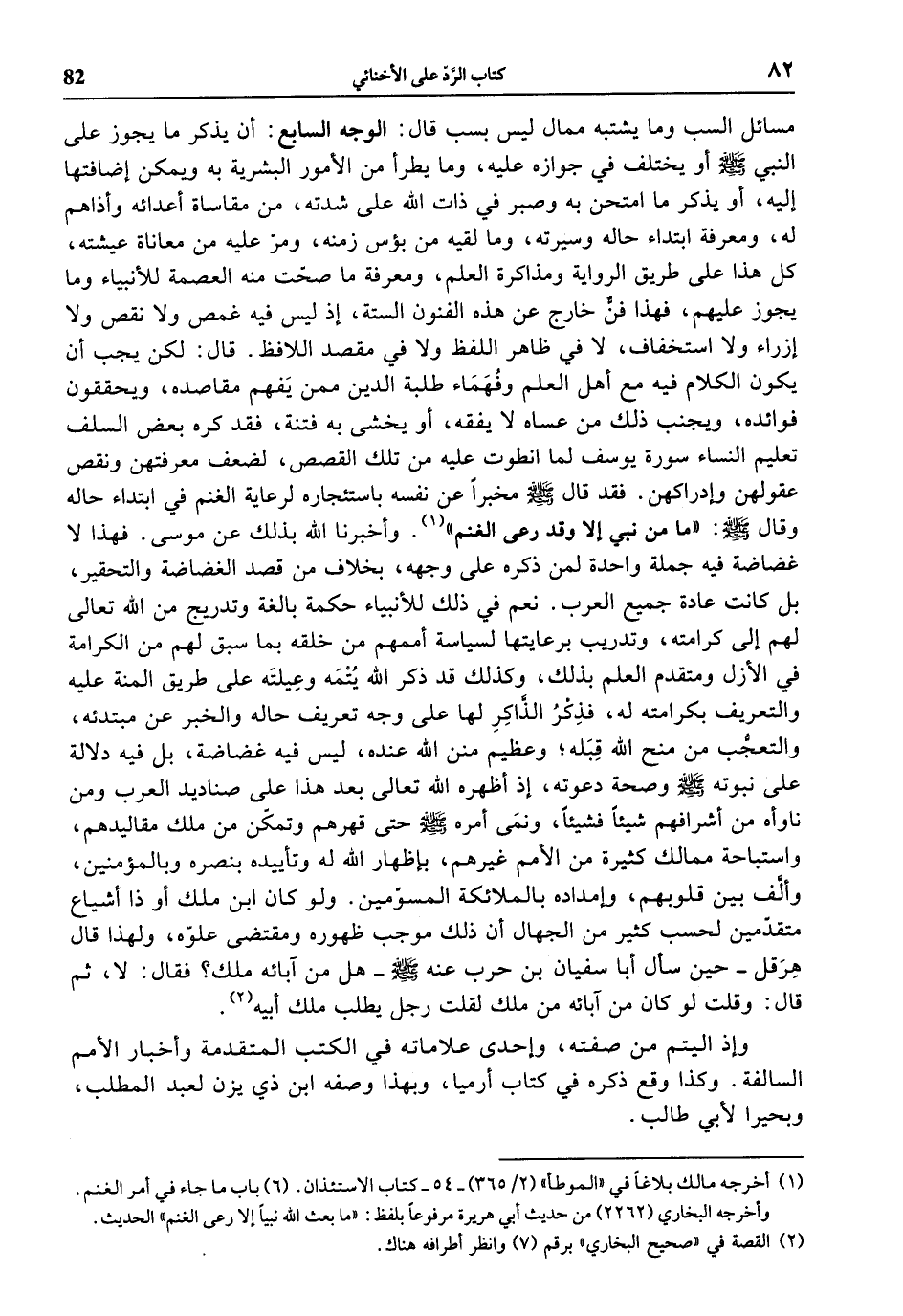 مسائل السب وما يشتبه ممال ليس بسب قال: الوجه السابع: أن يذكر ما يجوز على النبي صلى الله عليه وسلّم أو يختلف في جوازه عليه، وما يطرأ من الأمور البشرية به ويمكن إضافتها إليه، أو يذكر ما امتحن به وصبر في ذات الله على شدته، من مقاساة أعدائه وأذاهم له، ومعرفة ابتداء حاله وسيرته، وما لقيه من بؤس زمنه، ومرّ عليه من معاناة عيشته، كل هذا على طريق الرواية ومذاكرة العلم، ومعرفة ما صحّت منه العصمة للأنبياء وما يجوز عليهم، فهذا فنّ خارج عن هذه الفنون الستة، إذ ليس فيه غمص ولا نقص ولا إزراء ولا استخفاف، لا في ظاهر اللفظ ولا في مقصد اللافظ. قال: لكن يجب أن يكون الكلام فيه مع أهل العلم وفهماء طلبة الدين ممن يفهم مقاصده، ويحققون فوائده، ويجنب ذلك من عساه لا يفقه، أو يخشى به فتنة، فقد كره بعض السلف تعليم النساء سورة يوسف لما انطوت عليه من تلك القصص، لضعف معرفتهن ونقص عقولهن وإدراكهن. فقد قال صلى الله عليه وسلّم مخبرا عن نفسه باستئجاره لرعاية الغنم في ابتداء حاله وقال صلى الله عليه وسلّم: «ما من نبي إلا وقد رعى الغنم» «1». وأخبرنا الله بذلك عن موسى. فهذا لا غضاضة فيه جملة واحدة لمن ذكره على وجهه، بخلاف من قصد الغضاضة والتحقير، بل كانت عادة جميع العرب. نعم في ذلك للأنبياء حكمة بالغة وتدريج من الله تعالى لهم إلى كرامته، وتدريب برعايتها لسياسة أممهم من خلقه بما سبق لهم من الكرامة في الأزل ومتقدم العلم بذلك، وكذلك قد ذكر الله يتمه وعيلته على طريق المنة عليه والتعريف بكرامته له، فذكر الذّاكر لها على وجه تعريف حاله والخبر عن مبتدئه، والتعجّب من منح الله قبله؛ وعظيم منن الله عنده، ليس فيه غضاضة، بل فيه دلالة على نبوته صلى الله عليه وسلّم وصحة دعوته، إذ أظهره الله تعالى بعد هذا على صناديد العرب ومن ناوأه من أشرافهم شيئا فشيئا، ونمى أمره صلى الله عليه وسلّم حتى قهرهم وتمكّن من ملك مقاليدهم، واستباحة ممالك كثيرة من الأمم غيرهم، بإظهار الله له وتأييده بنصره وبالمؤمنين، وألّف بين قلوبهم، وإمداده بالملائكة المسوّمين. ولو كان ابن ملك أو ذا أشياع متقدّمين لحسب كثير من الجهال أن ذلك موجب ظهوره ومقتضى علوّه، ولهذا قال هرقل- حين سأل أبا سفيان بن حرب عنه صلى الله عليه وسلّم- هل من آبائه ملك؟ فقال: لا، ثم قال: وقلت لو كان من آبائه من ملك لقلت رجل يطلب ملك أبيه «2».