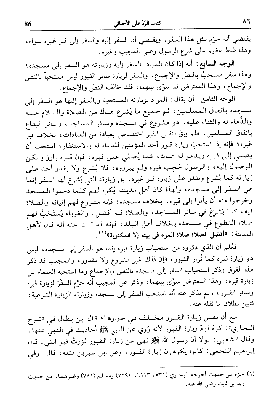 يقتضي أنه حرّم مثل هذا السفر، ويقتضي أن السفر إليه والسفر إلى قبر غيره سواء، وهذا غلط عظيم على شرع الرسول وعلى المجيب وغيره.