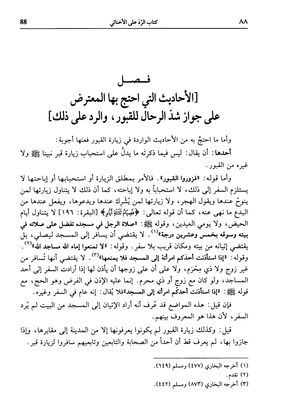 فصل [الأحاديث التي احتج بها المعترض على جواز شدّ الرحال للقبور، والرد على ذلك]