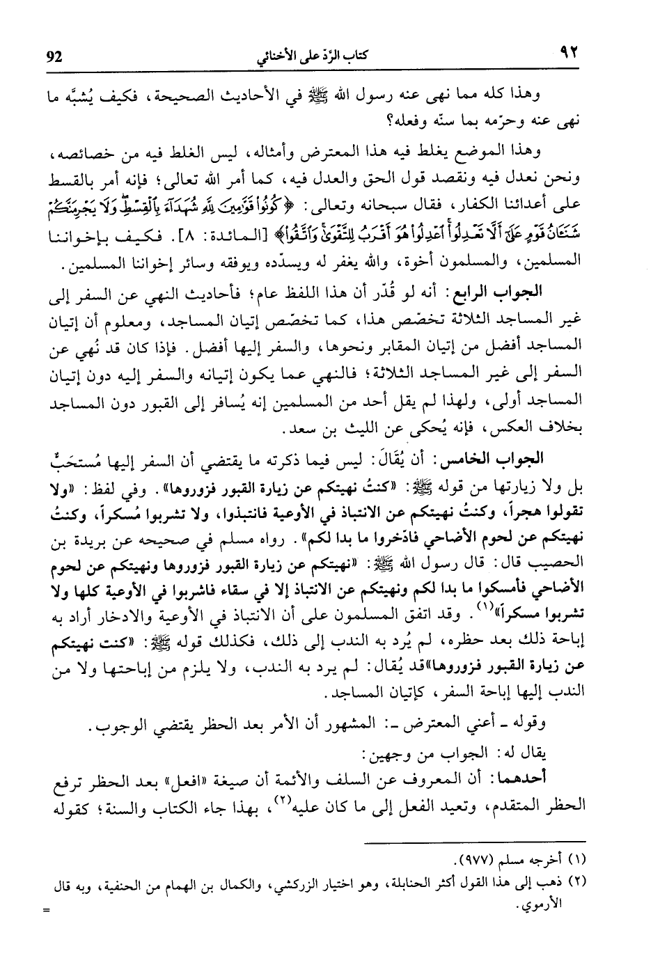 الجواب الخامس: أن يقال: ليس فيما ذكرته ما يقتضي أن السفر إليها مستحبّ بل ولا زيارتها من قوله صلى الله عليه وسلّم: «كنت نهيتكم عن زيارة القبور فزوروها». وفي لفظ: «ولا تقولوا هجرا، وكنت نهيتكم عن الانتباذ في الأوعية فانتبذوا، ولا تشربوا مسكرا، وكنت نهيتكم عن لحوم الأضاحي فادّخروا ما بدا لكم». رواه مسلم في صحيحه عن بريدة بن الحصيب قال: قال رسول الله صلى الله عليه وسلّم: «نهيتكم عن زيارة القبور فزوروها ونهيتكم عن لحوم الأضاحي فأمسكوا ما بدا لكم ونهيتكم عن الانتباذ إلا في سقاء فاشربوا في الأوعية كلها ولا تشربوا مسكرا» «1». وقد اتفق المسلمون على أن الانتباذ في الأوعية والادخار أراد به إباحة ذلك بعد حظره، لم يرد به الندب إلى ذلك، فكذلك قوله صلى الله عليه وسلّم: «كنت نهيتكم عن زيارة القبور فزوروها» قد يقال: لم يرد به الندب، ولا يلزم من إباحتها ولا من الندب إليها إباحة السفر، كإتيان المساجد.
