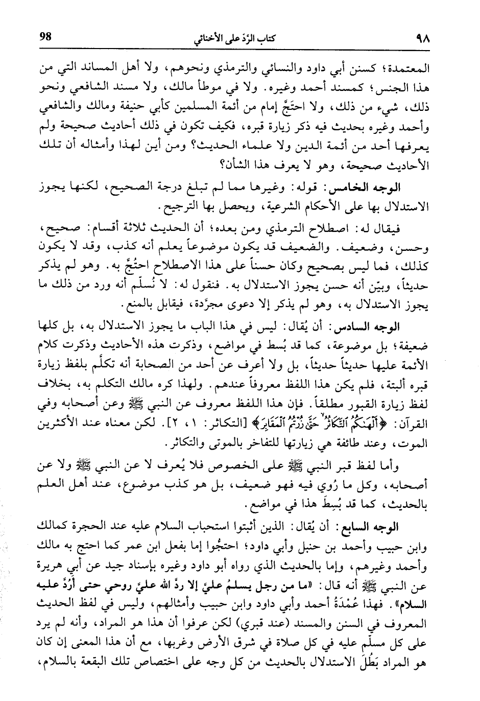 الوجه السابع: أن يقال: الذين أثبتوا استحباب السلام عليه عند الحجرة كمالك وابن حبيب وأحمد بن حنبل وأبي داود؛ احتجّوا إما بفعل ابن عمر كما احتج به مالك وأحمد وغيرهم، وإما بالحديث الذي رواه أبو داود وغيره بإسناد جيد عن أبي هريرة عن النبي صلى الله عليه وسلّم أنه قال: «ما من رجل يسلم عليّ إلا ردّ الله عليّ روحي حتى أردّ عليه السلام». فهذا عمدة أحمد وأبي داود وابن حبيب وأمثالهم، وليس في لفظ الحديث المعروف في السنن والمسند (عند قبري) لكن عرفوا أن هذا هو المراد، وأنه لم يرد على كل مسلّم عليه في كل صلاة في شرق الأرض وغربها، مع أن هذا المعنى إن كان هو المراد بطل الاستدلال بالحديث من كل وجه على اختصاص تلك البقعة بالسلام،
