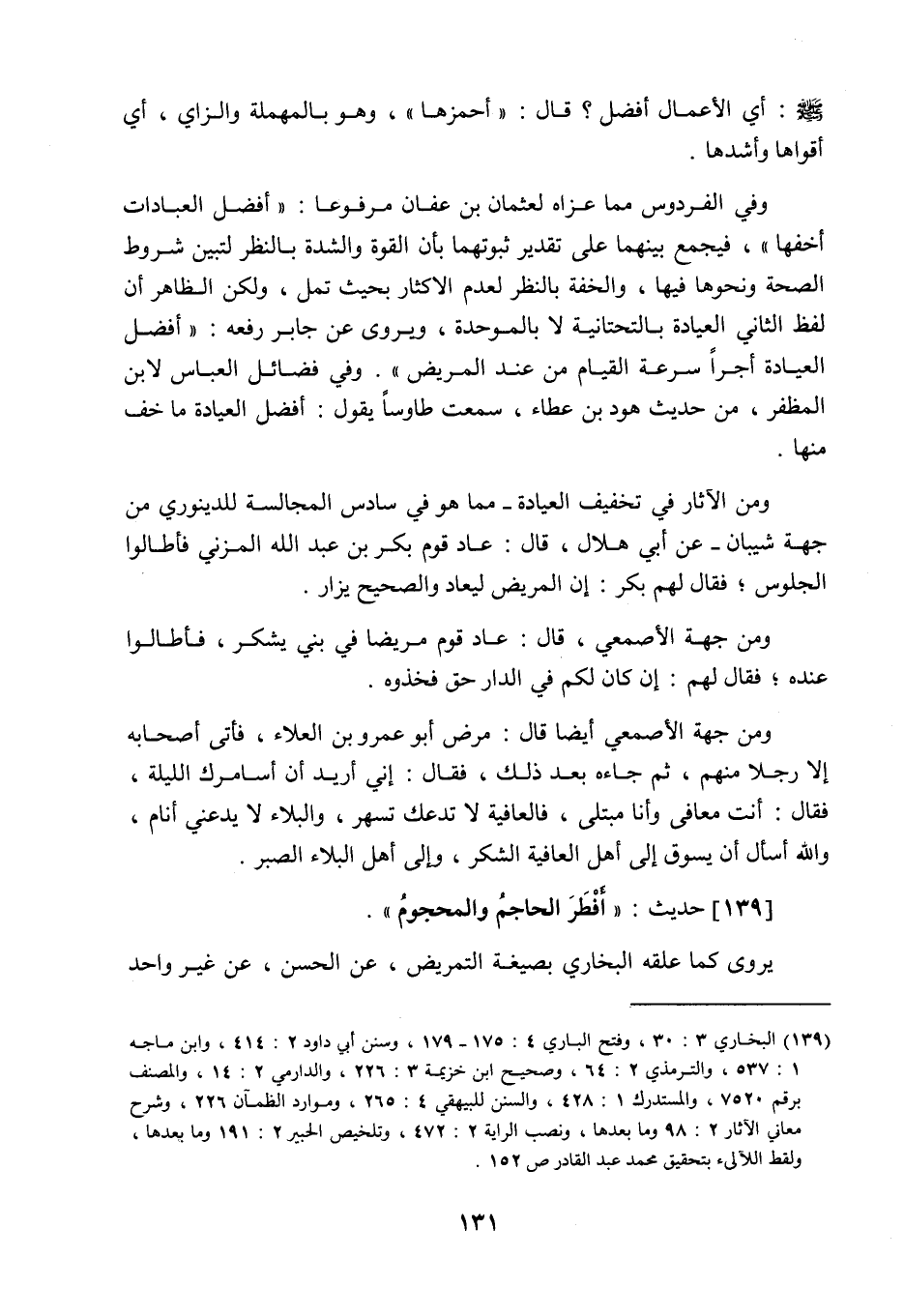 أي الأعمال أفضل؟ قال: أحمزها، وهو بالمهملة والزاي أي أقواها وأشدها، وفي الفردوس مما عزاه لعثمان بن عفان مرفوعا: أفضل العبادات أخفها، فيجمع بينهما على تقدير ثبوتهما بأن القوة والشدة بالنظر لتبين شروط الصحة ونحوها فيها، والخفة بالنظر لعدم الإكثار بحيث تمل، ولكن الظاهر أن لفظ الثاني العيادة بالتحتانية لا بالموحدة ويروى عن جابر رفعه: أفضل العيادة أجرا سرعة القيام من عند المريض، وفي فضائل العباس لابن المظفر من حديث هود بن عطاء سمعت طاوسا يقول: أفضل العيادة ما خف منها، ومن الآثار في تخفيف العيادة - مما هو في سادس المجالسة للدينوري من جهة شيبان - عن أبي هلال، قال: عاد قوم بكر بن عبد اللَّه المزني فأطالوا الجلوس: فقال لهم بكر: إن المريض ليعاد والصحيح يزار، ومن جهة الأصمعي قال: عاد قوم مريضا في بني يشكر، فأطالوا عنده، فقال لهم: إن كان لكم في الدار حق فخذوه، ومن جهة الأصمعي أيضا قال: مرض أبو عمرو بن العلاء فأتى أصحابه إلا رجلا منهم ثم جاءه بعد ذلك، فقال: إني أريد أن أسامرك الليلة، فقال: أنت معافى وأنا مبتلى، فالعافية لا تدعك تسهر، والبلاء لا يدعني أنام، واللَّه أسأل أن يسوق إلى أهل العافية الشكر، وإلى أهل البلاء الصبر.
