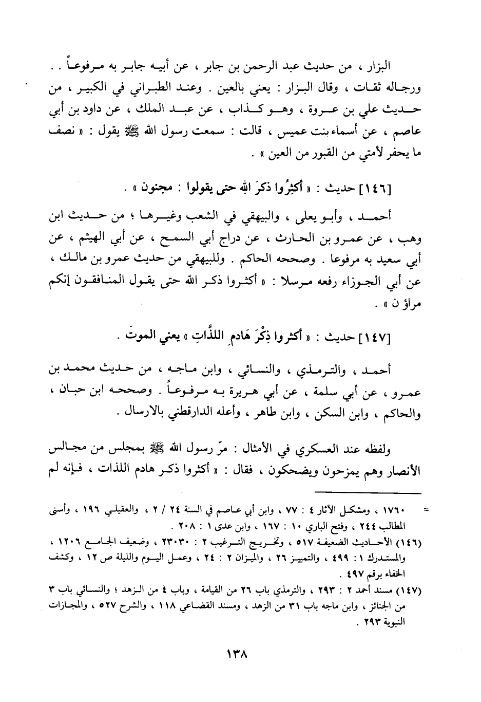 147 - حَدِيث: أَكْثِرُوا ذِكْرَ هَادِمِ اللَّذَّاتِ، يَعْنِي الْمَوْتَ، أحمد والترمذي والنسائي وابن ماجه من حديث محمد بن عمرو عن أبي سلمة عن أبي هريرة به مرفوعا، وصححه ابن حبان والحاكم وابن السكن وابن طاهر، وأعله الدارقطني بالإرسال، ولفظه عند العسكري في الأمثال: مر رسول اللَّه صَلَّى اللَّهُ عَلَيْهِ وَسَلَّمَ بمجلس من مجالس الأنصار وهم يمزحون ويضحكون، فقال: أكثروا ذكر هادم اللذات، فإنه لم