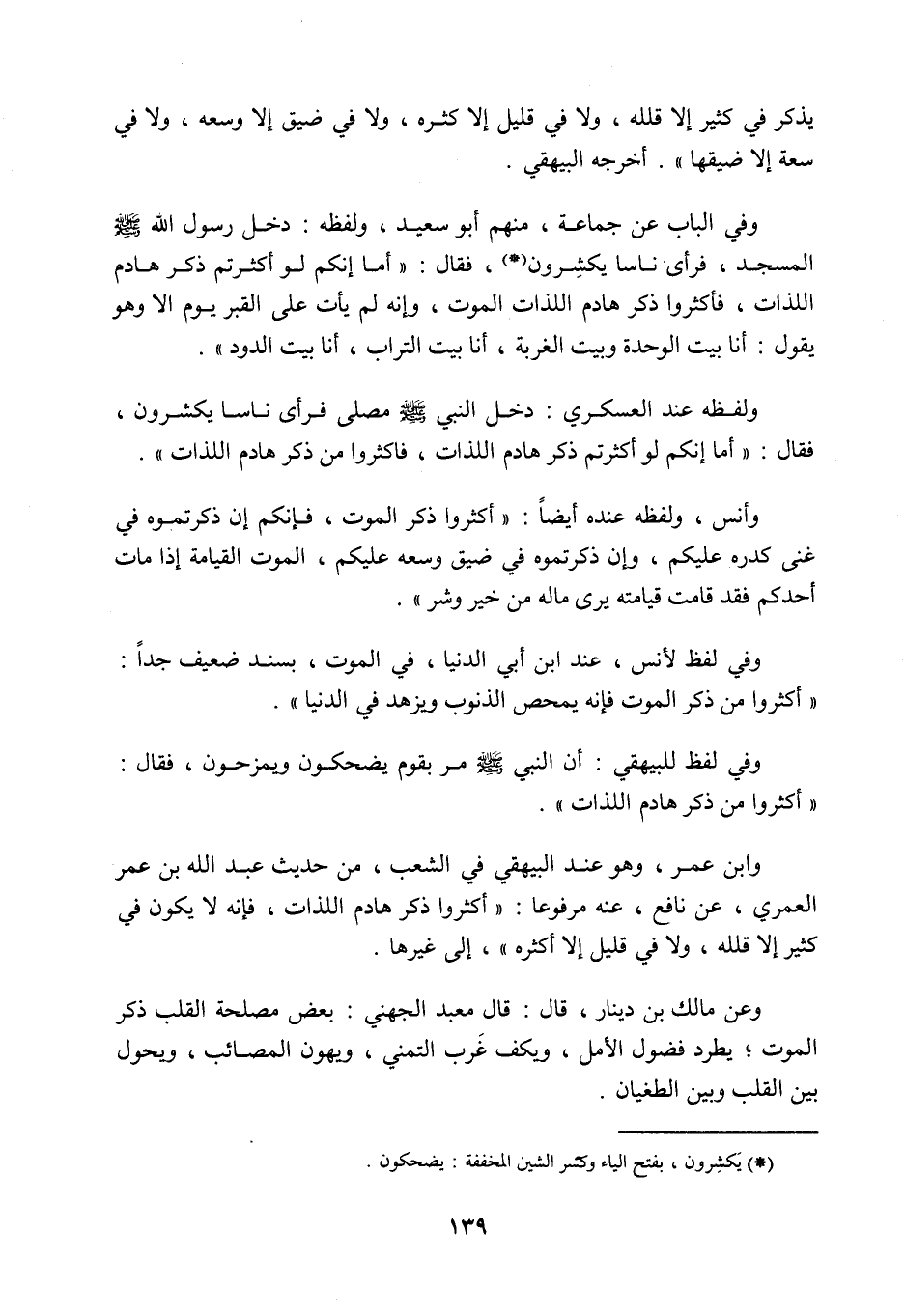 يذكر في كثير إلا قلله، ولا في قليل إلا كثره، ولا في ضيق إلا وسعه، ولا في سعة إلا ضيقها، أخرجه البيهقي، وفي الباب عن جماعة منهم أبو سعيد ولفظه: دخل رسول اللَّه صَلَّى اللَّهُ عَلَيْهِ وَسَلَّمَ المسجد فرأى ناسا يَكشِرون (¬1) ، فقال: أما إنكم لو أكثرتم ذكر هادم اللذات، فأكثروا ذكر هادم اللذات الموت، وإنه لم يأت على القبر يوم إلا وهو يقول: أنا بيت الوحدة، وبيت الغربة، أنا بيت التراب، أنا بيت الدود، ولفظه عند العسكري: دخل النبي صَلَّى اللَّهُ عَلَيْهِ وَسَلَّمَ مصلى فرأى ناسا يكشرون، فقال: أما إنكم لو أكثرتم ذكر هادم اللذات، فأكثروا من ذكر هادم اللذات. وأنس ولفظه عنده أيضا: أكثروا ذكر الموت، فإنكم إن ذكرتموه في غنى كدره عليكم، وإن ذكرتموه في ضيق وسعه عليكم، الموت القيامة، إذا مات أحدكم فقد قامت قيامته، يرى ما له من خير وشر، وفي لفظ لأنس عند ابن أبي الدنيا في الموت بسند ضعيف جدا: أكثروا من ذكر الموت، فإنه يمحص الذنوب، ويزهد في الدنيا، وفي لفظ للبيهقي: أن النبي صَلَّى اللَّهُ عَلَيْهِ وَسَلَّمَ مر بقوم يضحكون ويمزحون، فقال: أكثروا من ذكر هادم اللذات، وابن عمر وهو عند البيهقي في الشعب من حديث عبد اللَّه بن عمر العمري عن نافع عنه مرفوعا: أكثروا ذكر هادم اللذات، فإنه لا يكون في كثير إلا قلله، ولا في قليل إلا أكثره، إلى غيرها، وعن مالك بن دينار قال: قال معبد الجهني: بعض مصلحة القلب ذكر الموت، يطرد فضول الأمل، ويكف غَرب التمني، ويهون المصائب، ويحول بين القلب وبين الطغيان.