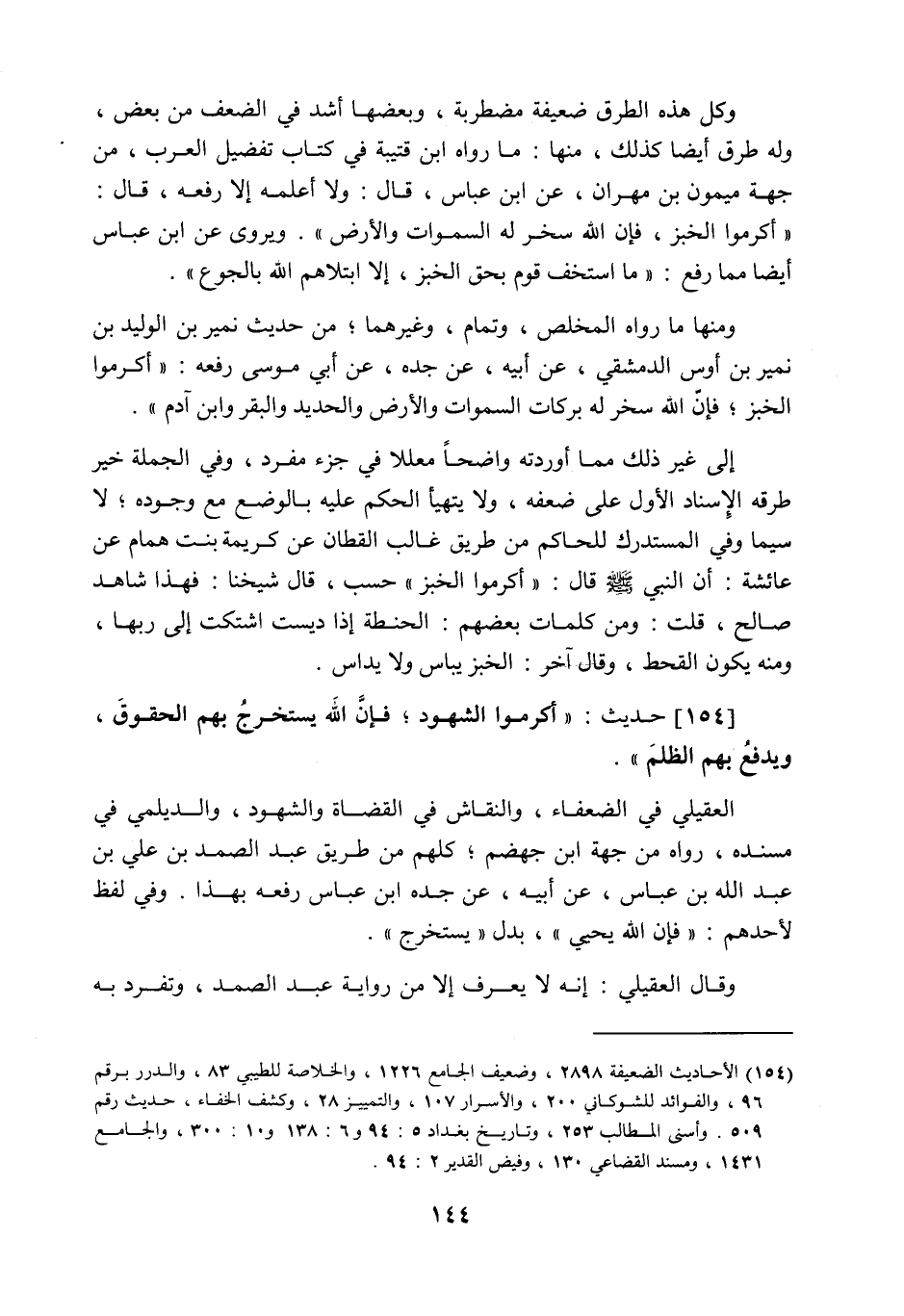 154 - حَدِيث: أَكْرِمُوا الشُّهُودَ، فَإِنَّ اللَّه يَسْتَخْرِجُ بِهِمُ الْحُقُوقَ، وَيَدْفَعُ بِهِمُ الظُّلْمَ، العقيلي في الضعفاء، والنقاش في القضاة والشهود، والديلمي في مسنده، رواه من جهة ابن جهضم، كلهم من طريق عبد الصمد بن علي بن عبد اللَّه بن عباس عن أبيه عن جده ابن عباس رفعه بهذا، وفي لفظ لأحدهم: فإن اللَّه يحيي، بدل يستخرج، وقال العقيلي: إنه لا يعرف إلا من رواية عبد الصمد، وتفرد به،