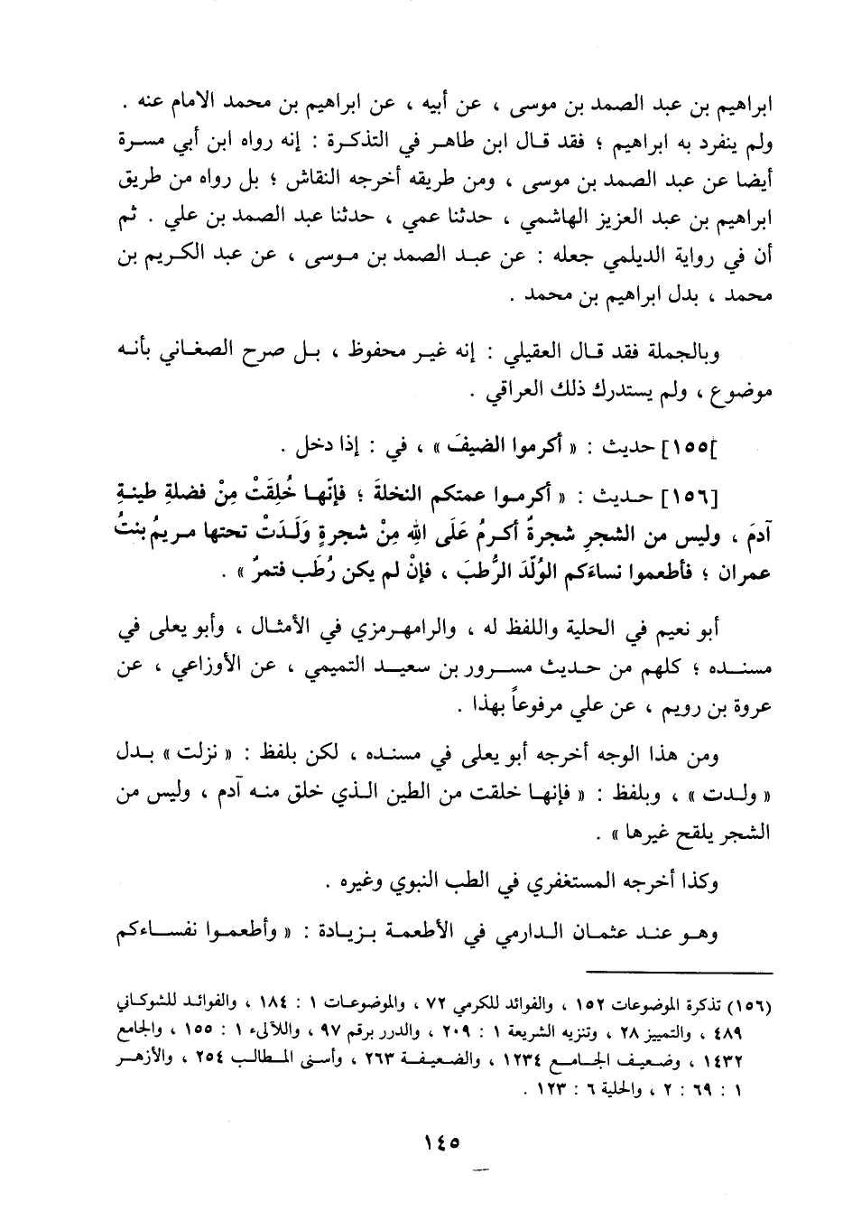 156 - حَدِيث: أَكْرِمُوا عَمَّتَكُمُ النَّخْلَةَ، فَإِنَّهَا خُلِقَتْ مِنْ فَضْلَةِ طِينَةِ آدَمَ، وَلَيْسَ مِنَ الشَّجَرِ شَجَرَةٌ أَكْرَمَ عَلَى اللَّه مِنْ شَجَرَةٍ وَلَدَتْ تَحْتَهَا مَرْيَمُ ابْنَةُ عِمْرَانَ فَأَطْعِمُوا نِسَاءَكُمُ الولِّد الرُّطَبَ، فَإِنْ لَمْ يَكُنْ رُطَبٌ فَتَمْرٌ، أبو نُعيم في الحلية، واللفظ له، والرامهرمزي في الأمثال، وأبو يعلى في مسنده، كلهم من حديث مسرور بن سعيد التميمي عن الأوزاعي عن عروة بن رويم عن على مرفوعا بهذا، ومن هذا الوجه أخرجه أبو يعلى في مسنده لكن بلفظ: نزلت، بدل، ولدت، وبلفظ: فإنها خلقت من الطين الذي خلق منه آدم، وليس من الشجر يلقح غيرها، وكذا أخرجه المستغفري في الطب النبوي وغيره، وهو عند عثمان الدارمي في الأطعمة، بزيادة: وأطعموا نفساءكم