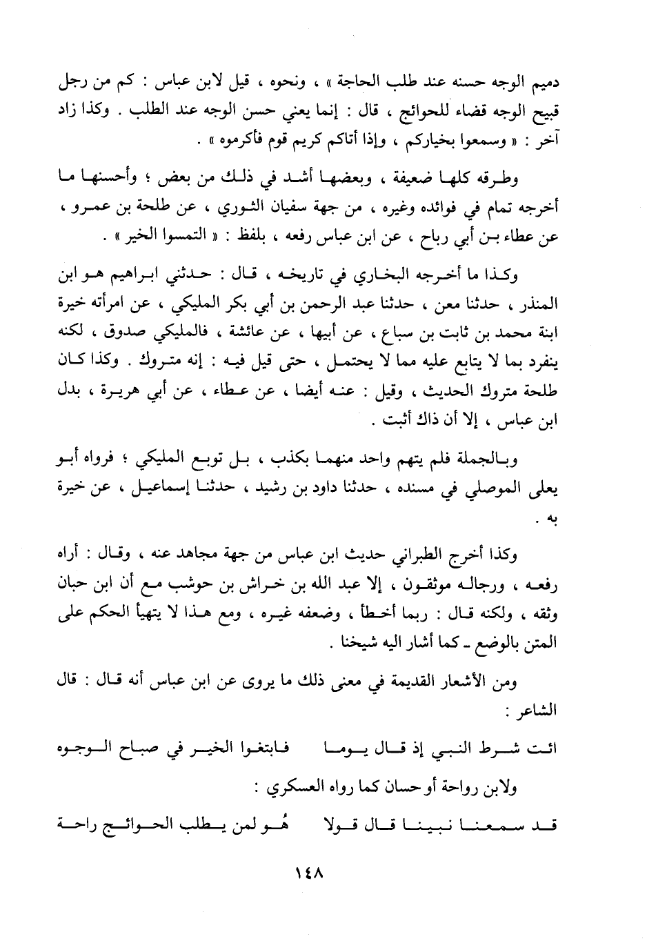 دميم الوجه حسنه عند طلب الحاجة، ونحوه، قيل لابن عباس: كم من رجل قبيح الوجه قضاء للحوائج، قال: إنما يعني حسن الوجه عند الطلب، وكذا زاد آخر: وسموا بخياركم، وإذا أتاكم كريم قوم فأكرموه، وطرقه كلها ضعيفة، وبعضها أشد في ذلك من بعض، وأحسنها ما أخرجه تمام في فوائده وغيره من جهة سفيان الثوري عن طلحة بن عمرو، عن عطاء ابن أبى رباح عن ابن عباس رفعه بلفظ: التمسوا الخير، وكذا ما أخرجه البخاري في تاريخه، قال: حدثني إبراهيم هو ابن المننر حدثنا معن حدثنا عبد الرحمن بن أبي بكر المليكي عن امرأته خيرة ابنة محمد بن ثابت بن سباع عن أبيها عن عائشة، فالمليكي صدوق، لكنه ينفرد بما لا يتابع عليه مما لا يحتمل، حتى قيل فيه: إنه متروك، وكذا كان طلحة متروك الحديث، وقيل: عنه أيضاً عن عطاء عن أبي هريرة بدل ابن عباس إلا أن ذاك أثبت، وبالجملة فلم يتهم واحد منهم بكذب، بل توبع المليكي فرواه أبو يعلى الموصلي في مسنده، حدثنا داود بن رشيد حدثنا إسماعيل عن خيرة به، وكذا أخرج الطبراني حديث ابن عباس من جهة مجاهد عنه، وقال: أراه رفعه، ورجاله موثقون، إلا عبد اللَّه بن خراش بن حوشب مع أن ابن حبان وثقه، ولكنه قال: ربما أخطأ وضعفه غيره، ومع هذا لا يتهيأ الحكم على المتن بالوضع كما أشار إليه شيخنا، ومن الأشعار القديمة في معنى ذلك ما يروى عن ابن عباس أنه قال: قال الشاعر: