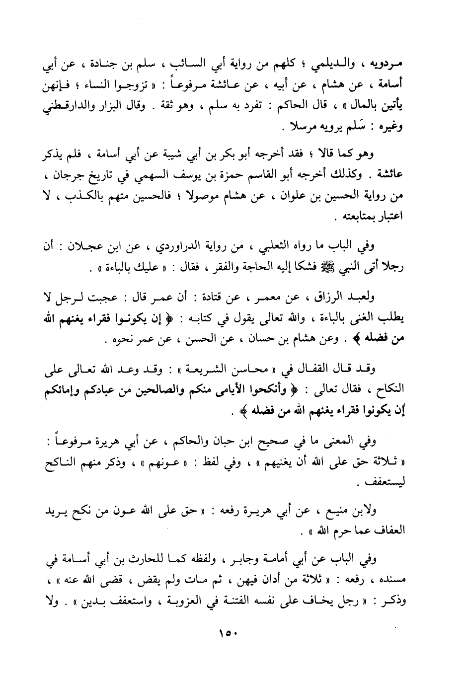 مردويه، والديلمي كلهم من رواية أبي السائب، سلم بن جنادة عن أبي أسامة عن هشام عن أبيه عن عائشة مرفوعا: تزوجوا النساء، فإنهن يأتين بالمال، قال الحاكم تفرد به سلم، وهو ثقة، وقال البزار والدارقطني وغيره سَلم يرويه مرسلا، وهو كما قالا، فقد أخرجه أبو بكر بن أبي شيبة عن أبي أسامة فلم يذكر عائشة، وكذلك أخرجه أبو داود، في المراسيل عن أبي توبة عن أبي أسامة، ولا ينتقد عليهم بما أخرجه أبو القاسم حمزة بن يوسف السهمي في تاريخ جرجان من رواية الحسين بن علوان عن هشام موصولا، فالحسين متهم بالكذب، لا اعتبار بمتابعته، وفي الباب ما رواه الثعلبي من رواية الدراوردي عن ابن عجلان، أن رجلا أتى النبي صَلَّى اللَّهُ عَلَيْهِ وَسَلَّمَ فشكا إليه الحاجة والفقر، فقال. عليك بالباءة، ولعبد الرزاق عن معمر عن قتادة، أن عمر قال. عجبت لرجل لا يطلب الغنى بالباءة، واللَّه تعالى يقول في كتابه " إِنْ يَكُونُوا فُقَرَاءَ يُغْنِهِمُ اللَّهُ مِنْ فَضْلِهِ " وعن هشام بن حسان، عن الحسن، عن عمر نحوه، وقد قال القفال في محاسن الشريعة، وقد وعد اللَّه تعالى على النكاح. فقال تعالى " وَأَنْكِحُوا الأَيَامَى مِنْكُمْ وَالصَّالِحِينَ مِنْ عِبَادِكُمْ وَإِمَائِكُمْ إِنْ يَكُونُوا فُقَرَاءَ يُغْنِهِمُ اللَّهُ مِنْ فَضْلِهِ " وفي المعنى ما في صحيح ابن حبان والحاكم عن أبي هريرة مرفوعا: ثلاثة حق على اللَّه أن يغنيهم، وفي لفظ: عونهم وذكر منهم الناكح ليستعفف، ولابن منيع عن أبي هريرة رفعه: حق على اللَّه عون من نكح يريد العفاف عما حرم اللَّه، وفي الباب عن أبي أمامة وجابر ولفظه كما للحارث بن أبي أسامة في مسنده رفعه: ثلاثة من أدان فيهن، ثم مات ولم يقض، قضى اللَّه عنه، وذكر: رجل يخاف على نفسه الفتنة في العزوبة، واستعفف بدين، ولا