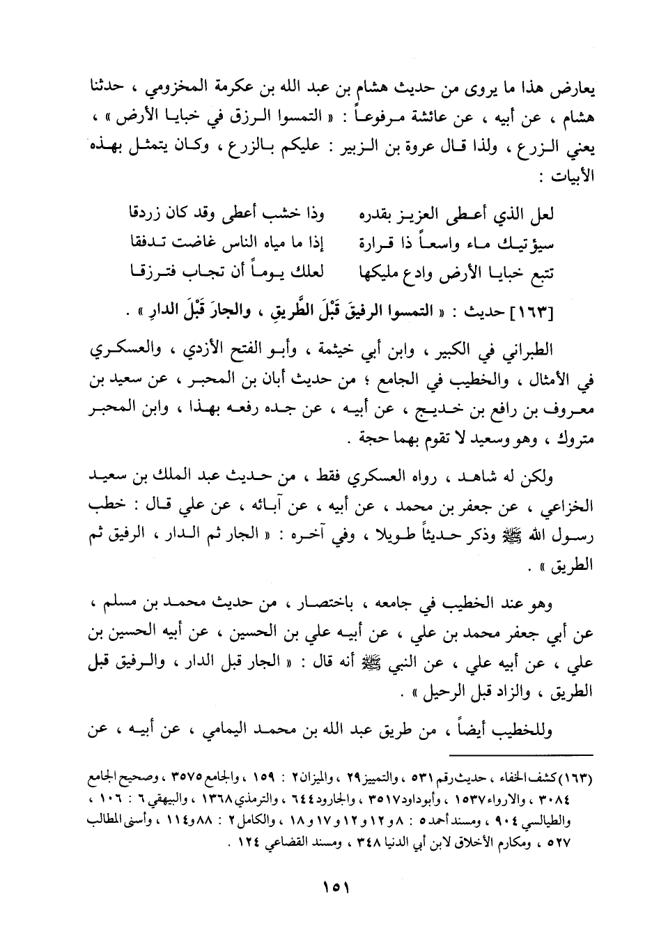 163 - حَدِيث: الْتَمِسُوا الرَّفِيقَ قَبْلَ الطَّرِيقَ، وَالْجَارَ قَبْلَ الدَّارِ، الطبراني في الكبير، وابن أبي خيثمة، وأبو الفتح الأزدي، والعسكري في الأمثال، والخطيب في الجامع، من حديث أبان بن المحبر عن سعيد بن معروف بن رافع بن خديج عن أبيه عن جده رفعه بهذا، وابن المحبر متروك، وهو وسعيد لا تقوم بهما حجة، ولكن له شاهد رواه العسكري فقط، من حديث عبد الملك بن سعيد الخزاعي عن جعفر بن محمد عن أبيه، عن آبائه عن علي قال: خطب رسول اللَّه صَلَّى اللَّهُ عَلَيْهِ وَسَلَّمَ وذكر حديثا طويلا وفي آخره: الجار، ثم الدار، الرفيق، ثم الطريق، وهو عند الخطيب في جامعه باختصار، من حديث محمد بن مسلم عن أبي جعفر محمد بن علي عن أبيه علي بن الحسين عن أبيه الحسين بن علي عن أبيه علي عن النبي صَلَّى اللَّهُ عَلَيْهِ وَسَلَّمَ أنه قال: الجار قبل الدار، والرفيق قبل الطريق، والزاد قبل الرحيل، وللخطيب أيضا من طريق عبد اللَّه بن محمد اليمامي عن أبيه عن