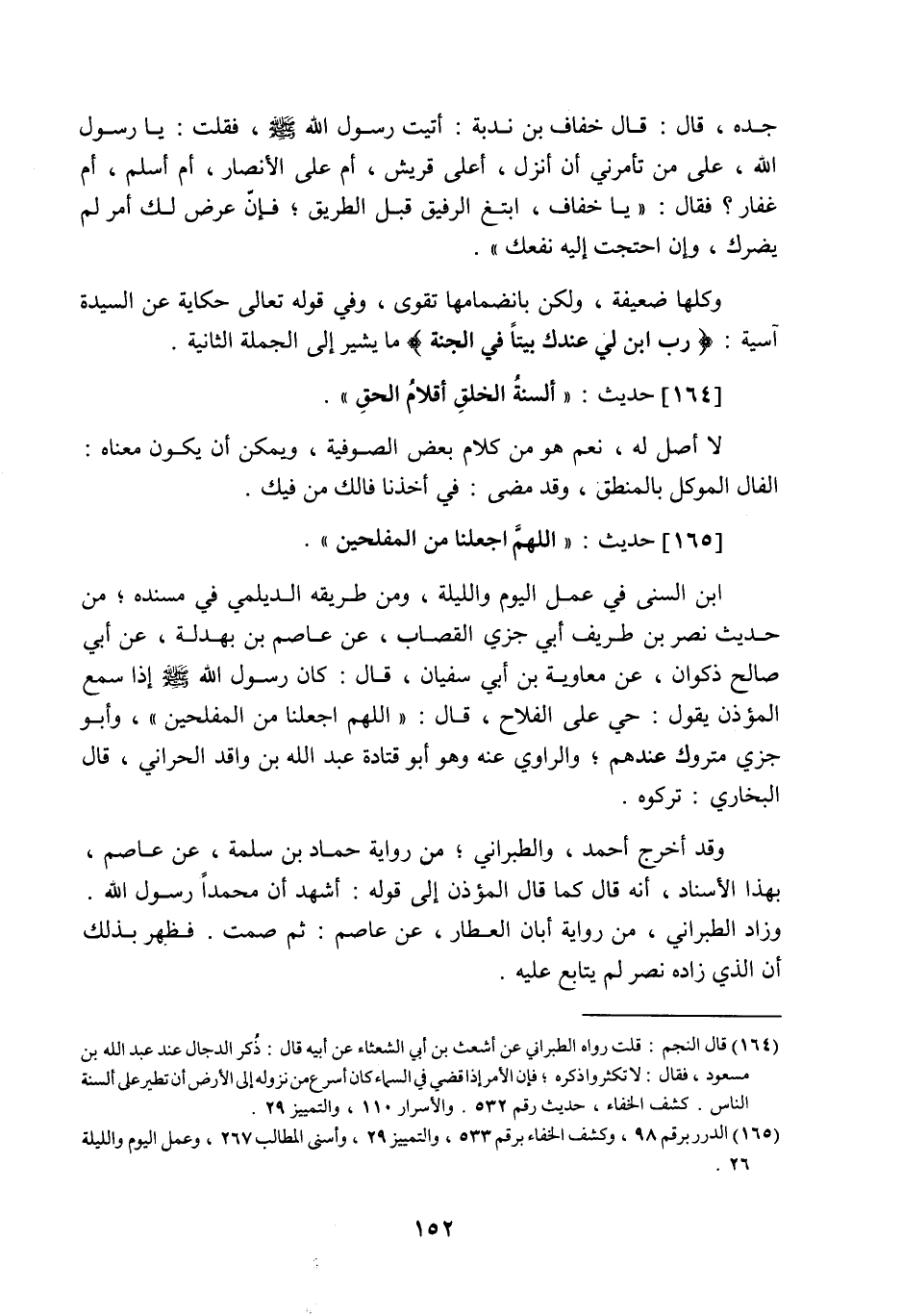 165 - حَدِيث: اللَّهم اجْعَلْنَا مِنَ الْمُفْلِحِينَ، ابْنُ السُّنِّيِّ فِي عَمَلِ الْيَوْمِ وَاللَّيْلَةِ، وَمِنْ طَرِيقِهِ الدَّيْلَمِيُّ فِي مُسْنَدِهِ مِنْ حَدِيثِ نَصْرِ بْنِ طَرِيفٍ أَبِي جَزِيٍّ الْقَصَّابِ عَنْ عَاصِمِ بْنِ بَهْدَلَةَ عَنْ أَبِي صَالِحٍ ذَكْوَانَ عَنْ مُعَاوِيَةَ بْنِ أَبِي سُفْيَانَ قَالَ: كَانَ رَسُولُ اللَّه صَلَّى اللَّهُ عَلَيْهِ وَسَلَّمَ إِذَا سَمِعَ الْمُؤَذِّنَ يَقُولُ: حَيَّ عَلَى الْفَلاحِ، قَالَ: اللَّهم اجْعَلْنَا مِنَ الْمُفْلِحِينَ، وأبو جزى متروك عندهم، والراوي عنه، وهو أبو قتادة عبد اللَّه بن واقد الحراني، قال البخاري: تركوه، وقد أخرج أحمد والطبراني من رواية حماد بن سلمة عن عاصم بهذا الإسناد، أنه قال كما قال المؤذن إلى قوله: أشهد أن محمدا رسول اللَّه، وزاد الطبراني من رواية أبان العطار عن عاصم: ثم صمت، فظهر بذلك أن الذي زاده نصر لم يتابع عليه.