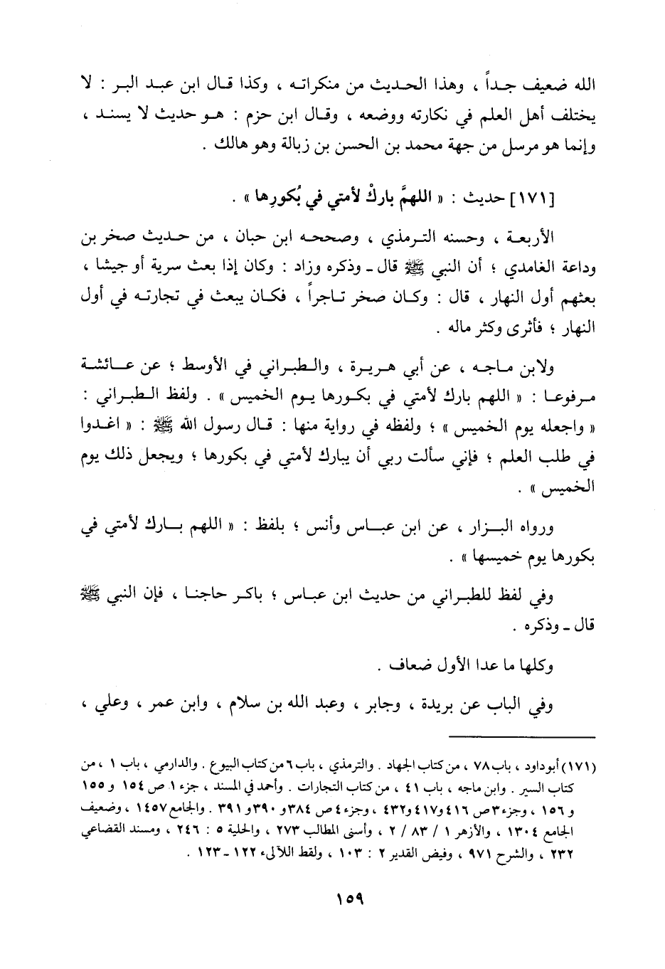 171 - حَدِيث: اللَّهم بَارِكْ لأُمَّتِي فِي بُكُورِهَا، الأربعة، وحسنه الترمذي، وصححه ابن حبان، من حديث صخر بن وداعة الغامدي، أن النبي صَلَّى اللَّهُ عَلَيْهِ وَسَلَّمَ، قال، وذكره، وزاد: وكان إذا بعث سرية أو جيشا، بعثهم أول النهار، قال: وكان صخر تاجرا، فكان يبعث في تجارته في أول النهار، فأثرى وكثر ماله، ولابن ماجه عن أبي هريرة، والطبراني في الأوسط، عن عائشة مرفوعا: اللَّهم بارك لأمتي في بكورها يوم الخميس، ولفظ الطبراني: واجعله يوم الخميس (¬1) ، ولفظه في رواية منها: قال رسول اللَّه صَلَّى اللَّهُ عَلَيْهِ وَسَلَّمَ: اغدوا في طلب العلم، فإني سألت ربي أن يبارك لأمتي في بكورها، ويجعل ذلك يوم الخميس، ورواه البزار عن ابن عباس وأنس، بلفظ: اللَّهم بارك لأمتي في بكورها يوم خميسها، وفي لفظ للطبراني من حديث ابن عباس: باكر حاجنا، فإن النبي صَلَّى اللَّهُ عَلَيْهِ وَسَلَّمَ، قال، وذكره، وكلها ما عدا الأول ضعاف، وفي الباب عن بريدة، وجابر، وعبد اللَّه بن سلام، وابن عمر، وعلي،