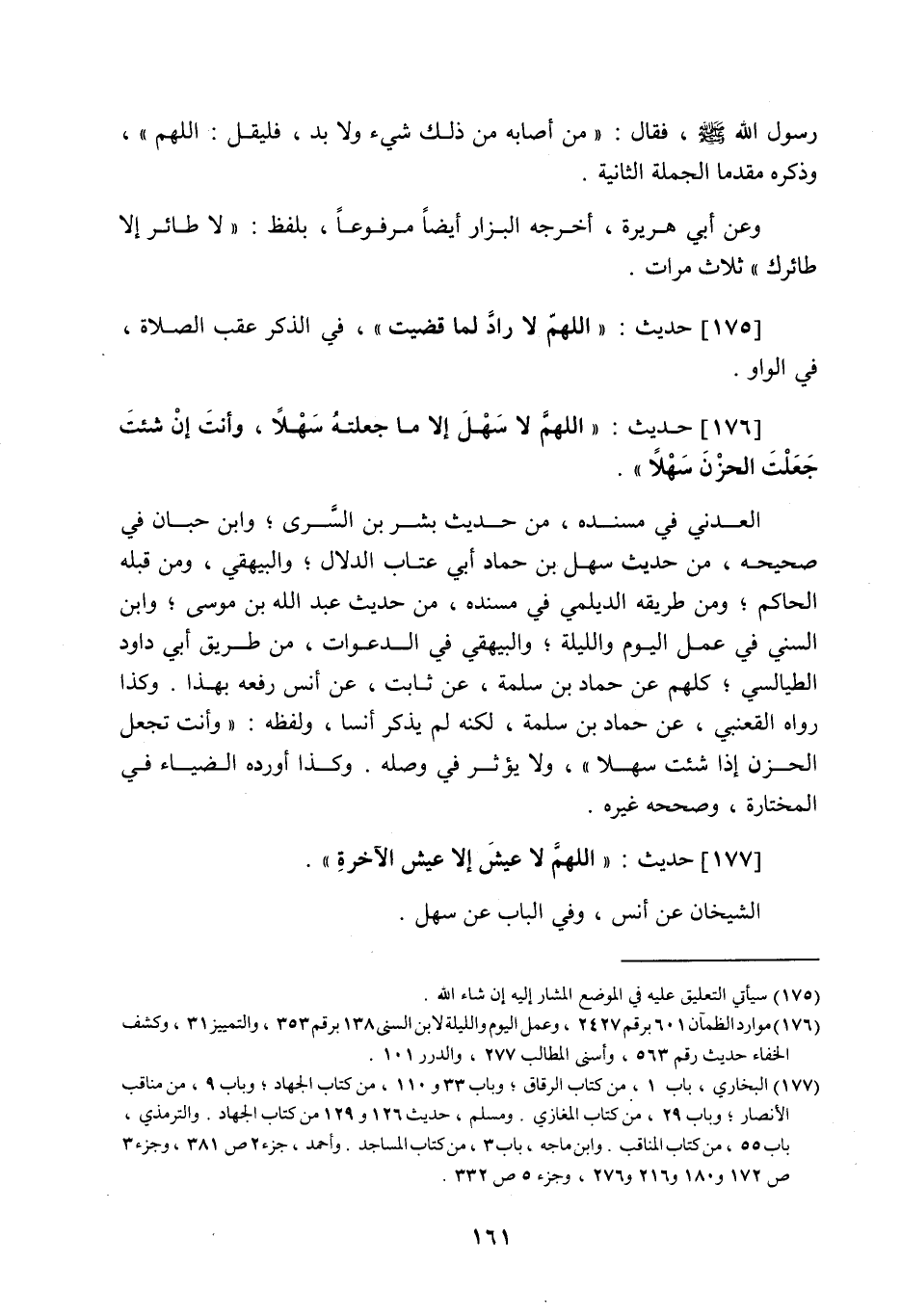 176 - حَدِيث: اللَّهم لا سَهْلَ إِلا مَا جَعَلْتَهُ سَهْلا، وَأَنْتَ إِنْ شِئْتَ جَعَلْتَ الْحَزَنَ سَهْلا، العدني في مسنده من حديث بشر بن السَّري، وابن حبان في صحيحه من حديث سهل بن حماد أبي عتاب الدلال، والبيهقي، ومن قبله الحاكم، ومن طريقه الديلمي في مسنده من حديث عبد اللَّه بن موسى، وابن السني في عمل اليوم والليلة، والبيهقي في الدعوات من طريق أبي داود الطيالسي، كلهم عن حماد بن سلمة عن ثابت عن أنس رفعه بهذا، وكذا رواه القعني عن حماد بن سلمة، لكنه لم يذكر أنسا، ولفظه: وأنت تجعل الحزن إذا شئت سهلا، ولا يؤثر في وصله، وكذا أورده الضياء في المختارة وصححه غيره.