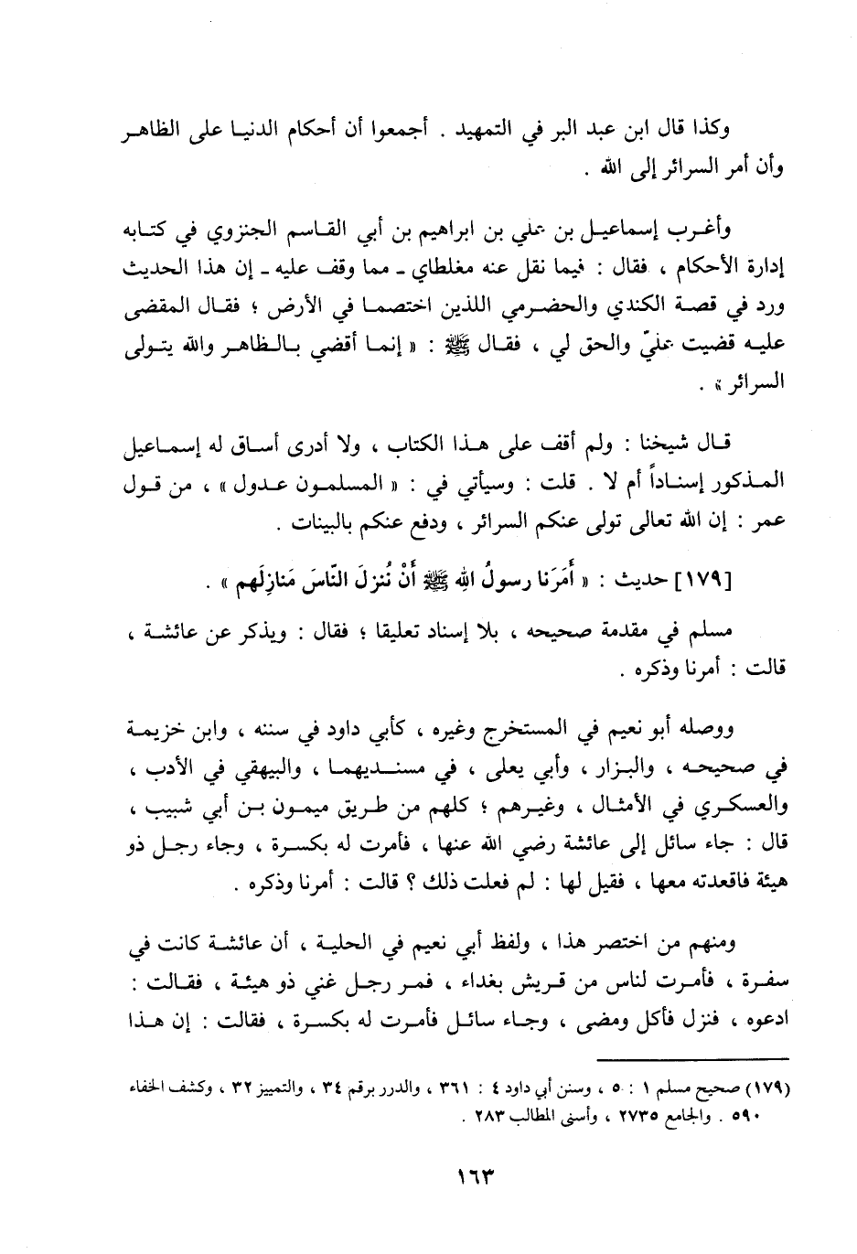 179 - حَدِيث: أَمَرَنَا رَسُولُ اللَّه صَلَّى اللَّهُ عَلَيْهِ وَسَلَّمَ أَنْ نُنْزِلَ النَّاسَ مَنَازِلَهُمْ، مسلم في مقدمة صحيحه بلا إسناد تعليقا، فقال: ويذكر عن عائشة، قالت: أمرنا، وذكره، ووصله أبو نُعيم في المستخرج وغيره، كأبي داود في سننه، وابن خزيمة في صحيحه، والبزار وأبي يعلى في مسنديهما، والبيهقي في الأدب، والعسكري في الأمثال وغيرهم، كلهم من طريق ميمون ابن أبي شبيب قال: جاء سائل إلى عائشة رضي اللَّه عنها، فأمرت له بكسرة، وجاء رجل ذو هيئة فأقعدته معها، فقيل لها: لم فعلت ذلك؟ قالت: أمرنا، وذكره، ومنهم من اختصر هذا، ولفظ أبي نُعيم في الحلية: أن عائشة كانت في سفرة فأمرت لناس من قريش بغداء، فمر رجل غني ذو هيئة، فقالت: ادعوه، فنزل فأكل ومضى، وجاء سائل فأمرت له بكسرة، فقالت: إن هذا