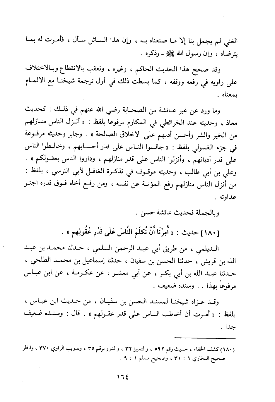 180 - حَدِيث: أُمِرْنَا أَنْ نُكَلِّمَ النَّاسَ عَلَى قَدْرِ عُقُولِهِمْ، الديلمي من طريق أبي عبد الرحمن السلمي، حدثنا محمد بن عبد اللَّه بن قريش حدثنا الحسن بن سفيان، حدثنا إسماعيل بن محمد الطلحي حدثنا عبد اللَّه بن أبي بكر، عن أبي معشر، عن عكرمة، عن ابن عباس مرفوعا بهذا، وسنده ضعيف، وقد عزاه شيخنا لمسند الحسن بن سفيان من حديث ابن عباس بلفظ: أمرت أن أخاطب الناس على قدر عقولهم، قال: وسنده ضعيف جدا،