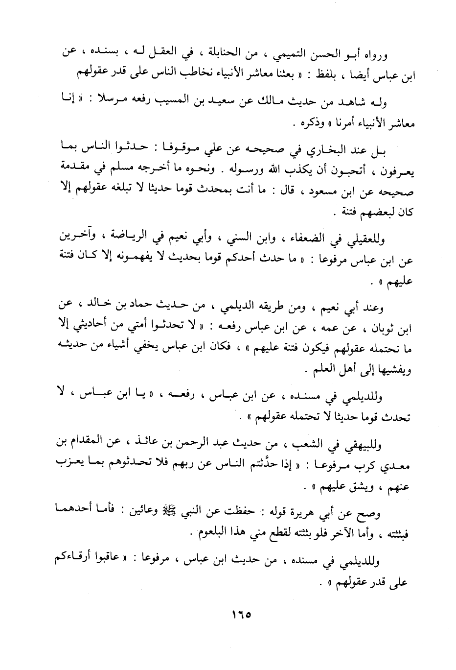 ورواه أبو الحسن التميمي من الحنابلة في العقل له بسنده عن ابن عباس أيضا بلفظ: بعثنا معاشر الأنبياء نخاطب الناس على قدر عقولهم، وله شاهد من حديث مالك عن سعيد بن المسيب رفعه مرسلا: إنا معاشر الأنبياء أمرنا وذكره، بل عند البخاري في صحيحه عن علي موقوفا: حدثوا الناس بما يعرفون، أتحبون أن يكذب اللَّه ورسوله، ونحوه ما أخرجه مسلم في مقدمة صحيحه عن ابن مسعود، قال: ما أنت بمحدث قوما حديثا لا تبلغه عقولهم إلا كان لبعضهم فتنة، وللعقيلي في الضعفاء، وابن السني، وأبي نُعيم في الرياضة، وآخرين عن ابن عباس مرفوعا: ما حدث أحدكم قوما بحديث لا يفهمونه إلا كان فتنة عليهم، وعند أبي نُعيم، ومن طريقه الديلمي من حديث حماد بن خالد عن ابن ثوبان عن عمه عن ابن عباس رفعه: لا تحدثوا أمتي من أحاديثي إلا ما تحتمله عقولهم فيكون فتنة عليهم، فكان ابن عباس يخفي أشياء من حديثه ويفشيها إلى أهل العلم، وللديلمي في مسنده عن ابن عباس، رفعه: يا ابن عباس، لا تحدث قوما حديثا لا تحتمله عقولهم، وللبيهقي في الشعب من حديث عبد الرحمن بن عائذ عن المقدام بن معدي كرب مرفوعا: إذا حدثتم الناس عن ربهم فلا تحدثوهم بما يعزب عنهم، ويشق عليهم، وصح عن أبي هريرة قوله: حفظت عن النبي صَلَّى اللَّهُ عَلَيْهِ وَسَلَّمَ وعائين، فأما أحدهما فبثثته، وأما الآخر فلو بثثته لقطع مني هذا البلعوم، وللديلمي في مسنده من حديث ابن عباس مرفوعا: عاقبوا أرقاءكم على قدر عقولهم،