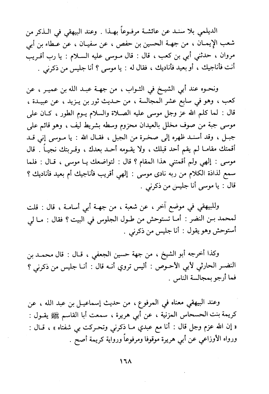 الدَّيْلَمِيُّ بِلا سَنَدٍ عَنْ عَائِشَةَ مَرْفُوعًا بِهَذَا، وعند البيهقي في الذكر من شعب الإيمان من جهة الحسين بن حفص عن سفيان عن عطاء بن أبي مروان حدثني أُبيَّ بن كعب قال: قال موسى عليه السلام: يا رب أقريب أنت فأناجيك، أو بعيد فأناديك، فقال له: يا موسى؟ أنا جليس من ذكرني، ونحوه عند أبي الشيخ في الثواب من جهة عبد اللَّه بن عمير عن كعب، وهو في سابع عشر المجالسة من حديث ثور بن يزيد عن عبيدة قال: لما كلم اللَّه عز وجل موسى عليه الصلاة والسلام يوم الطور كان على موسى جبة من صوف، مخلل بالعيدان، محزوم وسطه بشريط ليف، وهو قائم على جبل، وقد أسند ظهره إلى صخرة من الجبل، فقال اللَّه: يا موسى إني قد أقمتك مقاما لم يقم أحد قبلك، ولا يقومه أحد بعدك، وقربتك نجيا، قال موسى: إلهي ولم أقمتني هذا المقام؟ قال: لتواضعك يا موسى، قال: فلما سمع لذاذة الكلام من ربه نادى موسى: إلهي أقريب فأناجيك أم بعيد فأناديك، قال: يا موسى، أنا جليس من ذكرني، وللبيهقي في موضع آخر عن شعبة من جهة أبي أسامة، قال: قلت لمحمد بن النضر: أما تستوحش من طول الجلوس في البيت، فقال: ما لي أستوحش وهو يقول: أنا جليس من ذكرني، وكذا أخرجه أبو الشيخ من جهة حسين الجعفي قال: قال محمد بن النضر الحارثي لأبي الأحوص: أليس تروي أنه قال: أنا جليس من ذكرني؟ فما أرجو بمجالسة الناس، وعند البيهقي معناه في المرفوع من حديث إسماعيل بن عبد اللَّه عن كريمة ابنة الحسحاس المزنية عن أبي هريرة: سمعت أبا القاسم صَلَّى اللَّهُ عَلَيْهِ وَسَلَّمَ يقول: إن اللَّه عز وجل قال: أنا مع عبدي ما ذكرني وتحركت بي شفتاه، قال: ورواه الأوزاعي عن أبي هريرة موقوفا ومرفوعا ورواية كريمة أصح (¬1) .
