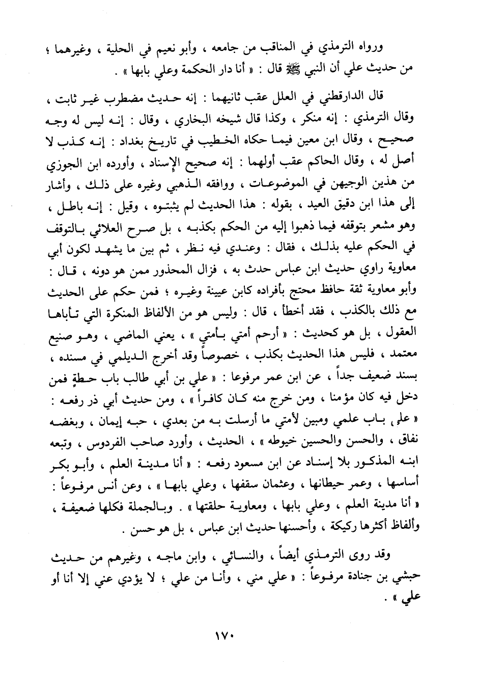 ورواه الترمذي في المناقب من جامعه، وأبو نُعيم في الحلية، وغيرهما من حديث علي أن النبي صَلَّى اللَّهُ عَلَيْهِ وَسَلَّمَ قال: أنا دار الحكمة، وعلي بابها، قال الدارقطني في العلل عقب ثانيهما: إنه حديث مضطرب غير ثابت، وقال الترمذي: إنه منكر، وكذا قال شيخه البخلري، وقال: إنه ليس له وجه صحيح، وقال ابن معين فيما حكاه الخطيب في تاريخ بغداد: إنه كذب لا أصل له، وقال الحاكم عقب أولهما: إنه صحيح الإسناد، وأورده ابن الجوزي من هذين الوجهين في الموضوعات، ووافقه الذهبي وغيره على ذلك، وأشار إلى هذا ابن دقيق العيد، بقوله: هذا الحديث لم يثبتوه، وقيل: إنه باطل، وهو مشعر بتوقفه فيما ذهبوا إليه من الحكم بكذبه، بل صرح العلائي بالتوقف في الحكم عليه بذلك، فقال: وعندي فيه نظر، ثم بين ما يشهد لكون أبي معاوية راوي حديث ابن عباس حدث به، فزال المحذور ممن هو دونه، قال: وأبو معاوية ثقة حافظ محتج بأفراده كابن عيينة وغيره، فمن حكم على الحديث مع ذلك بالكذب، فقد أخطأ، قال: وليس هو من الألفاظ المنكرة التي تأباها العقول، بل هو كحديث: أرحم أمتي بأمتي، يعني الماضي، وهو صنيع معتمد، فليس هذا الحديث بكذب، خصوصا وقد أخرج الديلمي في مسنده بسند ضعيف جدا، عن ابن عمر مرفوعا: علي بن أبي طالب باب حطةٍ فمن دخل فيه كان مؤمنا، ومن خرج منه كان كافرا، ومن حديث أبي ذر رفعه: علي باب علمي ومبين لأمتي ما أرسلت به من بعدي، حبه إيمان، وبغضه نفاق، والنظر إليه رأفة، ومن حديث ابن عباس رفعه: أنا ميزان العلم، وعلي كفتاه، والحسن والحسين خيوطه، الحديث، وأورد صاحب الفردوس وتبعه ابنه المذكور بلا إسناد عن ابن مسعود رفعه: أنا مدينة العلم، وأبو بكر أساسها، وعمر حيطانها، وعثمان سقفها، وعلي بابها، وعن أنس مرفوعا: أنا مدينة العلم، وعلي بابها، ومعاوية حلقتها، وبالجملة فكلها ضعيفة، وألفاظ أكثرها ركيكة، وأحسنها حديث ابن عباس، بل هو حسن، وقد روى الترمذي أيضا والنسائي، وابن ماجه، وغيرهم من حديث حبشي بن جنادة مرفوعا: علي مني، وأنا من علي، لا يؤدي عني إلا أنا أو علي،