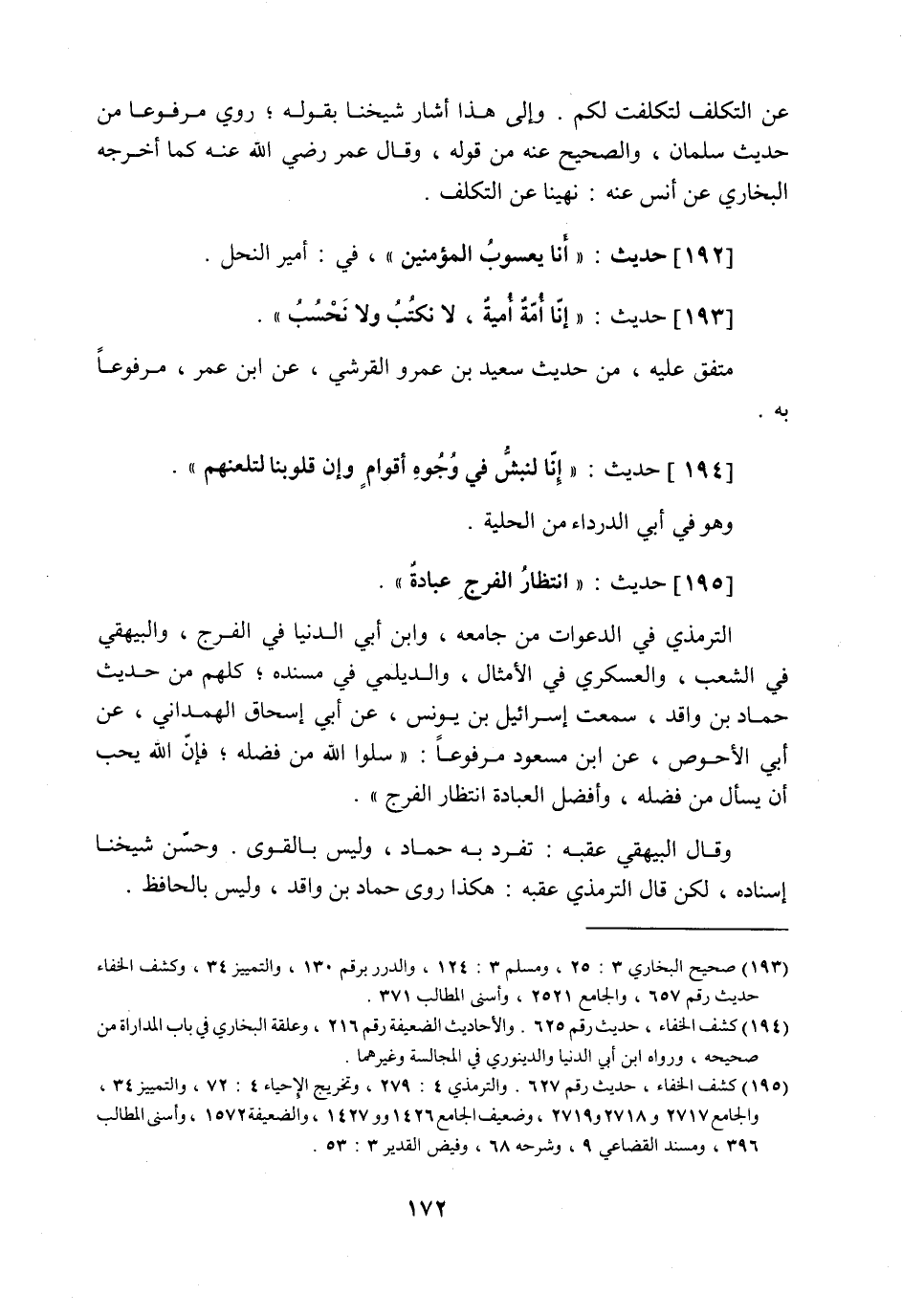 195 - حَدِيث: انْتِظَارُ الْفَرَجِ عِبَادَةٌ، الترمذي في الدعوات من جامعه، وابن أبي الدنيا في الفرج، والبيهقي في الشعب، والعسكري في الأمثال، والديلمي في مسنده، كلهم من حديث حماد بن واقد سمعت إسرائيل بن يونس عن أبي إسحاق الهمداني عن أبي الأحوص عن ابن مسعود مرفوعا: سلوا اللَّه من فضله، فإن اللَّه يحب أن يسأل من فضله، وأفضل العبادة انتظار الفرج، وقال البيهقي عقبه: تفرد به حماد، وليس بالقوي، وحسن شيخنا إسناده، لكن قال الترمذي عقبه: هكذا روى حماد بن واقد وليس بالحافظ،