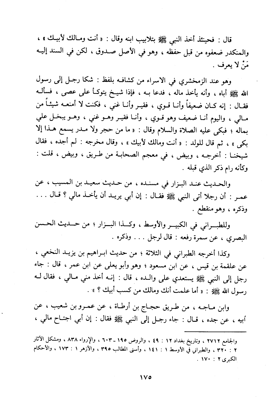قال: فحينئذ أخذ النبي صَلَّى اللَّهُ عَلَيْهِ وَسَلَّمَ بتلابيب ابنه وقال: أنت ومالك لأبيك، والمنكدر ضعفوه من قبل حفظه، وهو في الأصل صدوق، لكن في السند إليه من لا يعرف، وهو عند الزمخشري في الإسراء من كشافه بلفظ: شكا رجل إلى رسول اللَّه صَلَّى اللَّهُ عَلَيْهِ وَسَلَّمَ أباه، وأنه يأخذ ماله، فدعا به، فإذا شيخ يتوكأ على عصى، فسأله فقال: إنه كان ضعيفا وأنا قوي، فقيرا وأنا غني، فكنت لا أمنعه شيئا من مالي، واليوم أنا ضعيف، وهو قوي، وأنا فقير، وهو غني، وهو يبخل علي بمالي، فبكى عليه الصلاة والسلام وقال: ما من حجر ولا مدر يسمع هذا إلا بكى، ثم قال للولد: أنت ومالك لأبيك، وقال مخرجه لم أجده، فقال شيخنا أخرجه، وبيض، في معجم الصحابة من طريق، وبيض قلت: وكأنه رام ذكر الذي قبله، والحديث عند البزار في مسنده من حديث سعيد بن المسيب عن عمر أن رجلا أتى النبي صَلَّى اللَّهُ عَلَيْهِ وَسَلَّمَ فقال: إن أبي يريد أن يأخذ مالي؟ قال: وذكره وهو منقطع، وللطبراني في الكبير والأوسط، وكذا من حديث الحسن البصري عن سمرة رفعه: قال لرجل وذكره، وكذا أخرجه الطبراني في الثلاثة من حديث إبراهيم بن يزيد النخعي عن علقمة بن قيس عن ابن مسعود، وهو وأبو يعلى عن ابن عمر قال: جاء رجل إلى النبي صَلَّى اللَّهُ عَلَيْهِ وَسَلَّمَ يستعدي على والده، قال: أنه أخذ مني مالي، فقال له رسول اللَّه صَلَّى اللَّهُ عَلَيْهِ وَسَلَّمَ: أما علمت أنك ومالك من كسب أبيك. وابن ماجه من طريق حجاج بن أرطأة عن عمرو بن شعيب عن أبيه عن جده، قال: جاء رجل إلى النبي صَلَّى اللَّهُ عَلَيْهِ وَسَلَّمَ، فقال: إن أبي اجتاج مالي،