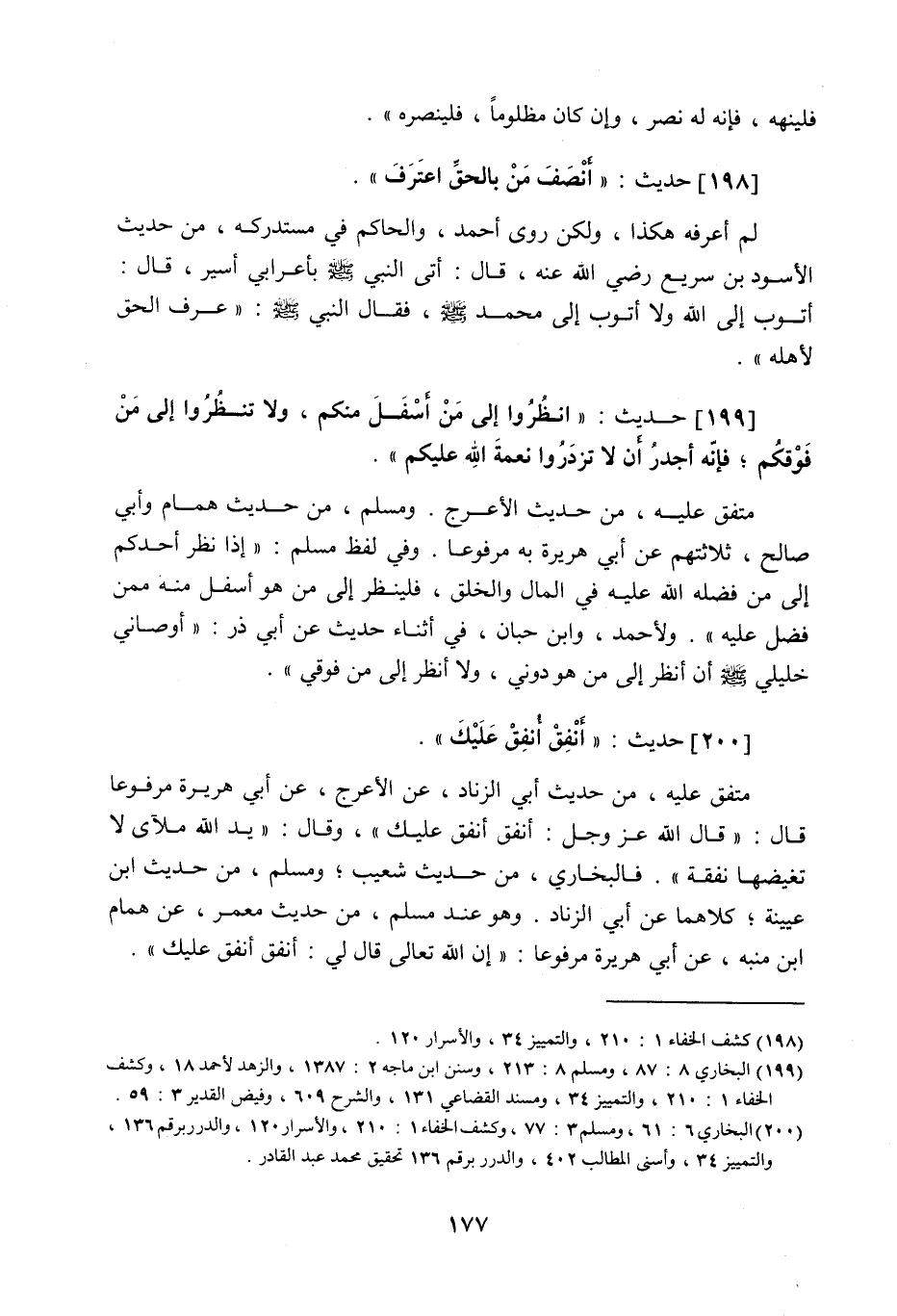 199 - حَدِيث: انْظُرُوا إِلَى مَنْ أَسْفَلَ مِنْكُمْ، وَلا تَنْظُرُوا إِلَى مَنْ فَوْقَكُمْ، فَإِنَّهُ أَجْدَرُ أَنْ لا تَزْدَرُوا نِعْمَةَ اللَّه عَلَيْكُمْ، متفق عليه من حديث الأعرج، ومسلم من حديث همام وأبي صالح، ثلاثتهم عن أبي هريرة به مرفوعا، وفي لفظ لمسلم: إذا نظر أحدكم إلى من فضله اللَّه عليه في المال والخلق، فلينظر إلى من هو أسفل منه ممن فضل عليه، ولأحمد وابن حبان في أثناء حديث عن أبي ذر: أوصاني خليلي صَلَّى اللَّهُ عَلَيْهِ وَسَلَّمَ أن أنظر إلى من هو دوني، ولا أنظر إلى من فوقي.