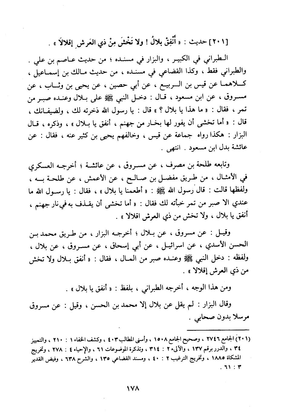 201 - حَدِيث: أَنْفِقْ بِلالُ وَلا تَخْشَ مِنْ ذِي الْعَرْشِ إِقْلالا، الطبراني في الكبير، والبزار في مسنده، من حديث عاصم بن علي، والطبراني فقط، وكذا القضاعي في مسنده، من حديث مالك بن إسماعيل، كلاهما عن قيس بن الربيع عن أبي حصين عن يحيى بن وئاب عن مسروق عن ابن مسعود، قال: دخل النبي صَلَّى اللَّهُ عَلَيْهِ وَسَلَّمَ على بلال، وعنده صبر من تمر، فقال: ما هذا يا بلال؟ قال: يا رسول اللَّه ذخرته لك، ولضيفانك، قال: أما تخشى أن يفور لها بخار من جهنم، أنفق يا بلال، وذكره، قال البزار: هكذا رواه جماعة عن قيس، وخالفهم يحيى بن كثير عنه، فقال: عن عائشة بدل ابن مسعود انتهى، وتابعه طلحة بن مصرف عن مسروق عن عائشة، أخرجه العسكري في الأمثال، من طريق مفضل بن صالح عن الأعمش عن طلحة به، ولفظها: قالت: قال رسول اللَّه صَلَّى اللَّهُ عَلَيْهِ وَسَلَّمَ: أطعمنا يا بلال، فقال: يا رسول اللَّه ما عندي إلا صبر من تمر خبأته لك، فقال: أما تخشى أن يقذف به في نار جهنم، أنفق يا بلال؟ ولا تخش من ذي العرش إقلالا، وقيل عن مسروق عن بلال، أخرجه البزار من طريق محمد بن الحسن الأسدي، عن إسرائيل عن أبي إسحاق عن مسروق عن بلال، ولفظه: دخل النبي صَلَّى اللَّهُ عَلَيْهِ وَسَلَّمَ وعنده صبر من المال، فقال: أنفق بلال ولا تخش من ذي العرش إقلالا، ومن هذا الوجه أخرجه الطبراني، بلفظ: أنفق يا بلال، وقال البزار: لم يقل عن بلال إلا محمد بن الحسن، وقيل عن مسروق مرسلا بدون صحابي،