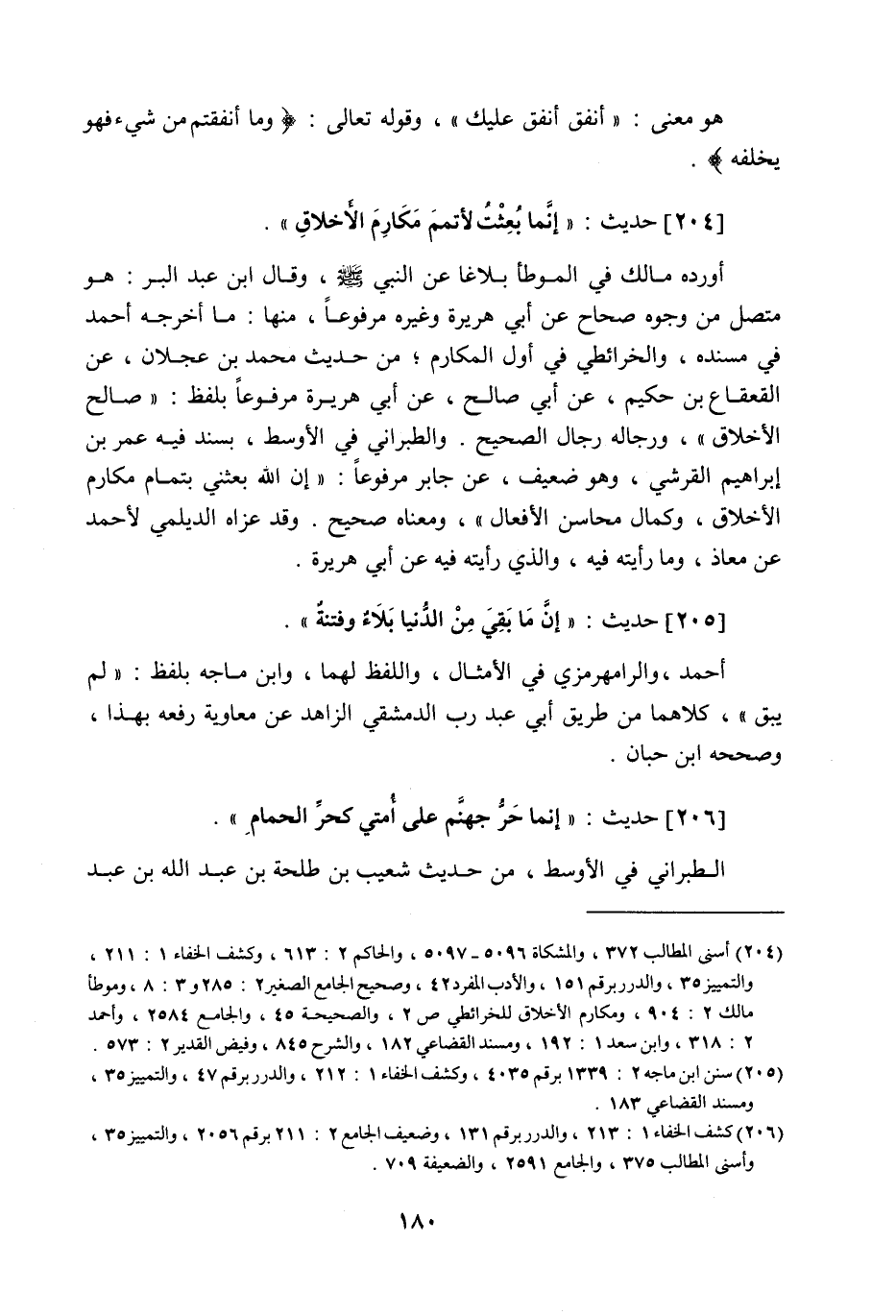 204 - حَدِيث: إِنَّمَا بُعِثْتُ لأُتَمِّمَ مَكَارِمَ الأَخْلاقِ، أورده مالك في الموطأ بلاغا عن النبي صَلَّى اللَّهُ عَلَيْهِ وَسَلَّمَ، وقال ابن عبد البر: هو متصل من وجوه صحاح عن أبي هريرة وغيره مرفوعا، منها ما أخرجه أحمد في مسنده، والخرائطي في أول المكارم، من حديث محمد بن عجلان، عن القعقاع بن حكيم، عن أبي صالح، عن أبي هريرة مرفوعا، بلفظ: صالح الأخلاق، ورجاله رجال الصحيح، والطبراني في الأوسط، بسند فيه عمر بن إبراهيم القرشي، وهو ضعيف عن جابر مرفوعا: إن اللَّه بعثني بتمام مكارم الأخلاق، وكمال محاسن الأفعال، ومعناه صحيح، وقد عزاه الديلمي لأحمد عن معاذ، وما رأيته فيه، والذي رأيته فيه عن أبي هريرة.