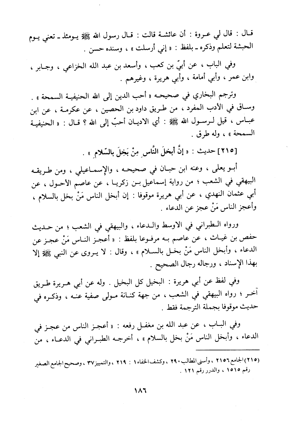 215 - حَدِيث: إِنَّ أَبْخَلَ النَّاسِ مَنْ بَخِلَ بِالسَّلامِ، أبو يعلى، وعنه ابن حبان في صحيحه، والإسماعيلي، ومن طريقه البيهقي في الشعب، من رواية إسماعيل بن زكريا عن عاصم الأحول عن أبي عثمان النهدي عن أبي هريرة موقوفا: إن أبخل التاس من بخل بالسلام، وأعجز الناس من عجز عن الدعاء، ورواه الطبراني في الأوسط والدعاء، والبيهقي في الشعب، من حديث حفص بن غياث عن عاصم به مرفوعا، بلفظ: أعجز الناس من عجز عن الدعاء، وأبخل الناس من بخل بالسلام، وقال: لا يروى عن النبي إلا بهذا الإسناد، ورجاله رجال الصحيح، وفي لفظ عن أبي هريرة: البخيل كل البخيل، وله عن أبي هريرة طريق آخر، رواه البيهقي في الشعب، من جهة كنانة مولى صفية عنه، وذكره في حديث موقوفا بجملة الترجمة فقط، وفي الباب عن عبد اللَّه بن مغفل رفعه: أعجز الناس من عجز عن الدعاء، وأبخل الناس من بخل بالسلام، أخرجه الطبراني في الدعاء، من