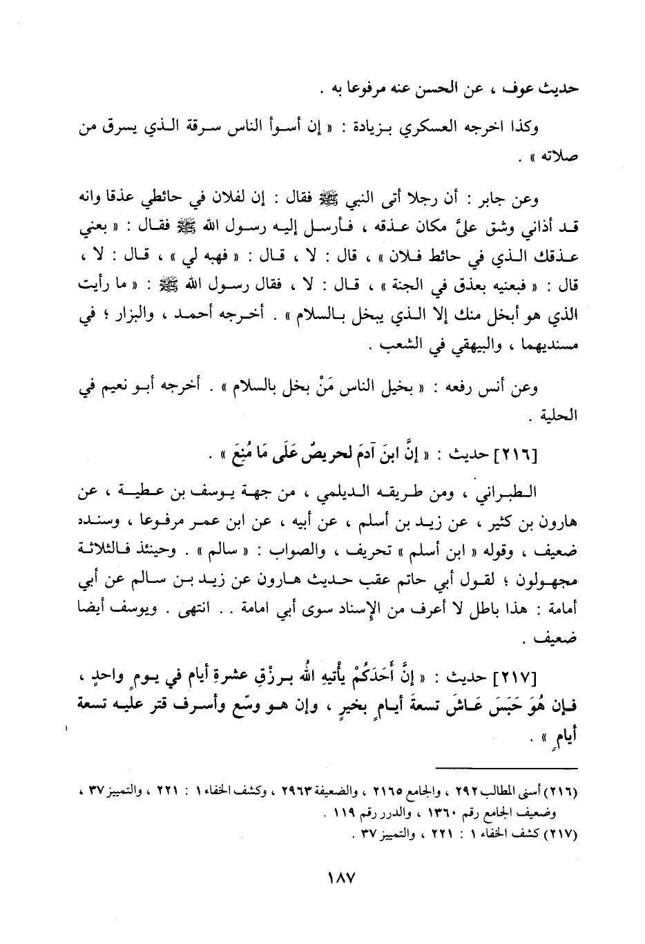 حديث عوف عن الحسن عنه مرفوعا به، وكذا أخرجه العسكري بزيادة: إن أسوأ الناس سرقة الذي يسرق من صلاته، وعن جابر أن رجلا أتى النبي صَلَّى اللَّهُ عَلَيْهِ وَسَلَّمَ، فقال: إن لفلان في حائطي عذقا، وإنه قد آذاني وشق علي مكان عذقه، فأرسل إليه رسول اللَّه صَلَّى اللَّهُ عَلَيْهِ وَسَلَّمَ، فقال: بعني عذقك الذي في حائط فلان، قال: لا، قال: فهبه لي، قال: لا، قال: فبعنيه بغدق في الجنة، قال: لا، فقال رسول اللَّه صَلَّى اللَّهُ عَلَيْهِ وَسَلَّمَ: ما رأيت الذي هو أبخل منك إلا الذي يبخل بالسلام، أخرجه أحمد، والبزار في مسنديهما، والبيهقي في الشعب، وعن أنس رفعه: بخيل الناس من بخل بالسلام، أخرجه أبو نُعيم في الحلية.