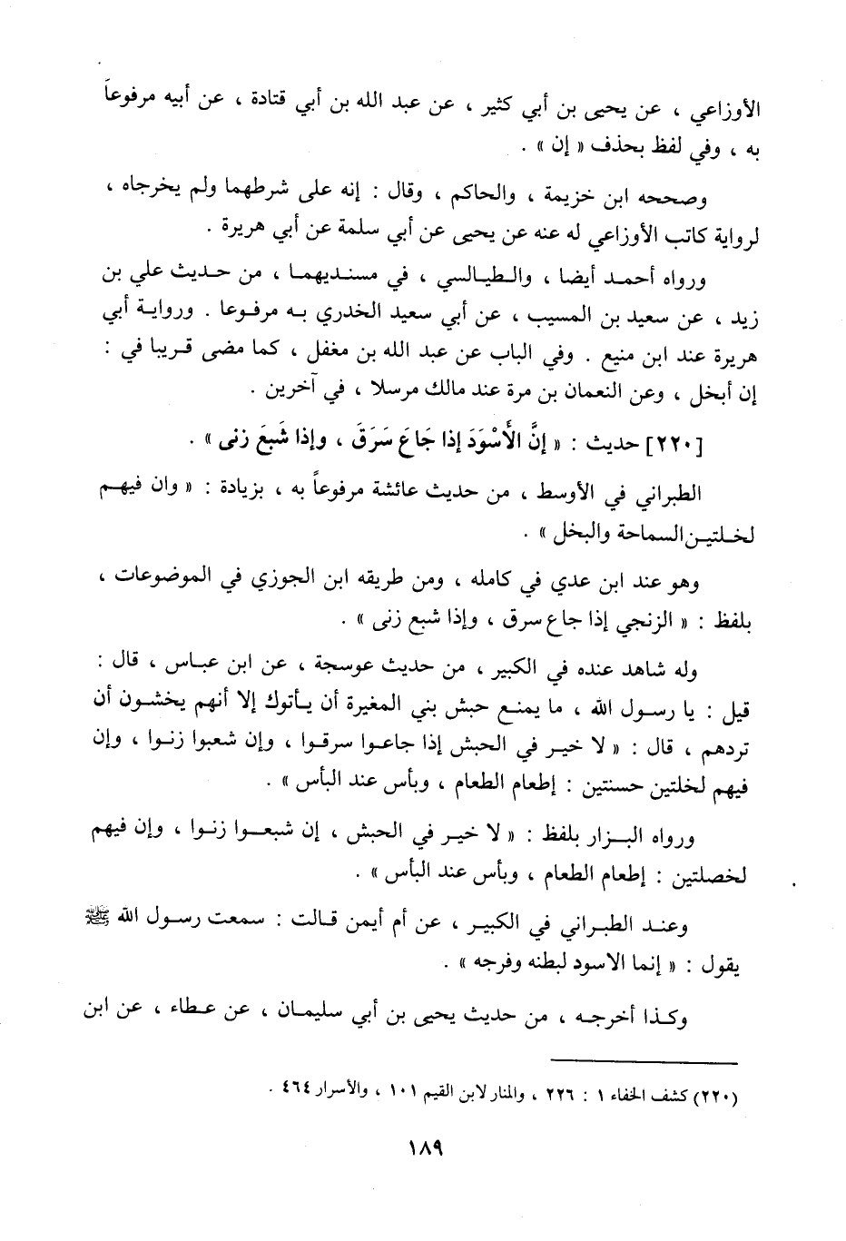 220 - حَدِيث: إِنَّ الأَسْوَدَ إِذَا جَاعَ سَرَقَ، وَإِذَا شَبِعَ زَنَى، الطبراني في الأوسط، من حديث عائشة مرفوعا به بزيادة: وإن فيهم لخلتين صدق السماحة، والبخل، وهو عند ابن عدي في كامله، ومن طريقه ابن الجوزي في الموضوعات، بلفظ: الزنجي إذا جاع سرق، وإذا شبع زنى، وله شاهد عنده في الكبير، من حديث عوسجة عن ابن عباس، قال: قيل يا رسول اللَّه، ما يمنع حبش بني المغيرة أن يأتوك إلا أنهم يخشون أن تردهم، قال: لا خير في الحبش، إذا جاعوا سرقوا، وإن شبعوا زنوا، وإن فيهم لخلتين حسنتين: إطعام الطعام، وبأس عند البأس، ورواه البزار بلفظ: لا خير في الحبش، إن شبعوا زنوا، وإن فيهم لخصلتين: إطعام الطعام، وبأس عند البأس، وعند الطبراني في الكبير عن أم أيمن، قالت: سمعت رسول اللَّه صَلَّى اللَّهُ عَلَيْهِ وَسَلَّمَ يقول: إنما الأسود لبطنه وفرجه، وكذا أخرجه من حديث يحيى بن أبي سليمان عن عطاء عن ابن
