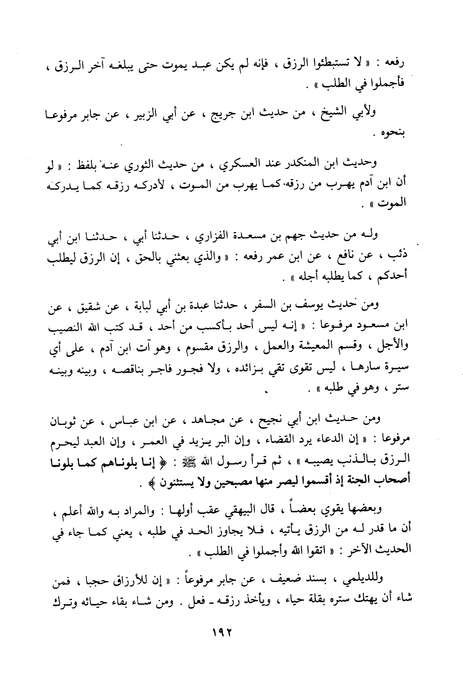رفعه: لا تستبطئوا الرزق، فإنه لم يكن عبد يموت حتى يبلغه آخر الرزق، فأجملوا في الطلب، ولأبي الشيخ من حديث ابن جريج، عن أبي الزبير، عن جابر، مرفوعا بنحوه، وحديث ابن المنكدر عند العسكري من حديث الثوري عنه بلفظ: لو أن ابن آدم يهرب من رزقه كما يهرب من الموت لأدركه رزقه، كما يدركه الموت، وله من حديث جهم بن مسعدة الفزاري حدثنا أبي حدثنا ابن أبي ذئب، عن نافع عن ابن عمر رفعه: والذي بعثني بالحق إن الرزق ليطلب أحدكم، كما يطلبه أجله، ومن حديث يوسف بن السفر حدثنا عبدة بن أبي لبابة، عن شقيق عن ابن مسعود مرفوعا: إنه ليس أحد بأكسب من أحد، قد كتب اللَّه النصيب والأجل، وقسم المعيشة والعمل، والرزق مقسوم، وهو آت ابن آدم، على أي سيرة سارها، ليس تقوى تقي بزائده، ولا فجور فاجر بناقصه، وبينه وبينه ستر، وهو في طلبه، ومن حديث ابن أبي نجيح عن مجاهد عن ابن عباس عن ثوبان مرفوعا: إن الدعاء يرد القضاء، وإن البر يزيد في العمر، وإن العبد ليحرم الرزق بالذنب يصيبه، ثم قرأ رسول اللَّه صَلَّى اللَّهُ عَلَيْهِ وَسَلَّمَ {إِنَّا بَلَوْنَاهُمْ كَمَا بَلَوْنَا أَصْحَابَ الْجَنَّةِ إِذْ أَقْسَمُوا لَيَصْرِمُنَّهَا مُصْبِحِينَ وَلا يَسْتَثْنُونَ} وبعضها يقوي بعضا، قال البيهقي عقب أولها: والمراد به واللَّه أعلم، أن ما قدر له من الرزق يأتيه، فلا يجاوز الحد في طلبه، يعني كما جاء في الحديث الآخر: اتقوا اللَّه وأجملوا في الطلب، وللديلمي بسند ضعيف عن جابر مرفوعا: إن للأرزاق حجبا فمن شاء أن يهتك ستره بقلة حياء، ويأخذ رزقه فعل، ومن شاء بقاء حيائه وترك