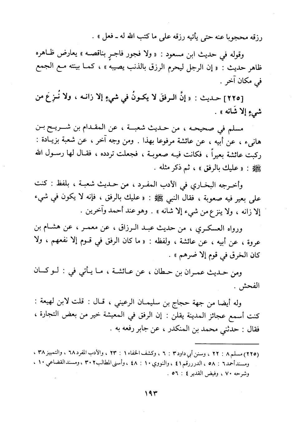 225 - حَدِيث: إِنَّ الرِّفْقَ لا يَكُونُ فِي شَيْءٍ إِلا زَانَهُ، وَلا نُزِعَ مِنْ شَيْءٍ إِلا شَانَهُ، مسلم في صحيحه، من حديث شعبة عن المقدام بن شريح بن هانئ عن أبيه عن عائشة مرفوعا بهذا، ومن وجه آخر، عن شعبة بزيادة: ركبت عائشة بعيرا، فكانت فيه صعوبة، فجعلت تردده، فقال لها رسول اللَّه صَلَّى اللَّهُ عَلَيْهِ وَسَلَّمَ: عليك بالرفق، ثم ذكر مثله، وأخرجه البخاري في الأدب المفرد من حديث شعبة بلفظ: كنت على بعير فيه صعوبة، فقال النبي صَلَّى اللَّهُ عَلَيْهِ وَسَلَّمَ: عليك بالرفق، فإنه لا يكون في شيء إلا زانه، ولا ينزع من شيء إلا شانه، وهو عند أحمد وآخرين، ورواه العسكري من حديث عبد الرزاق عن معمر عن هشام بن عروة عن أبيه عن عائشة، ولفظه: ما كان الرفق في قوم إلا نفعهم، ولا كان الخرق في قوم إلا ضرهم، ومن حديث عمران بن حطان عن عائشة ما يأتي في: لو كان الفحش، وله أيضا من جهة حجاج بن سليمان الرعيني قال: قلت لابن لهيعة: كنت أسمع عجائز المدينة يقلن: إن الرفق في المعيشة خير من بعض التجارة، فقال: حدثني محمد بن المنكدر عن جابر رفعه به،
