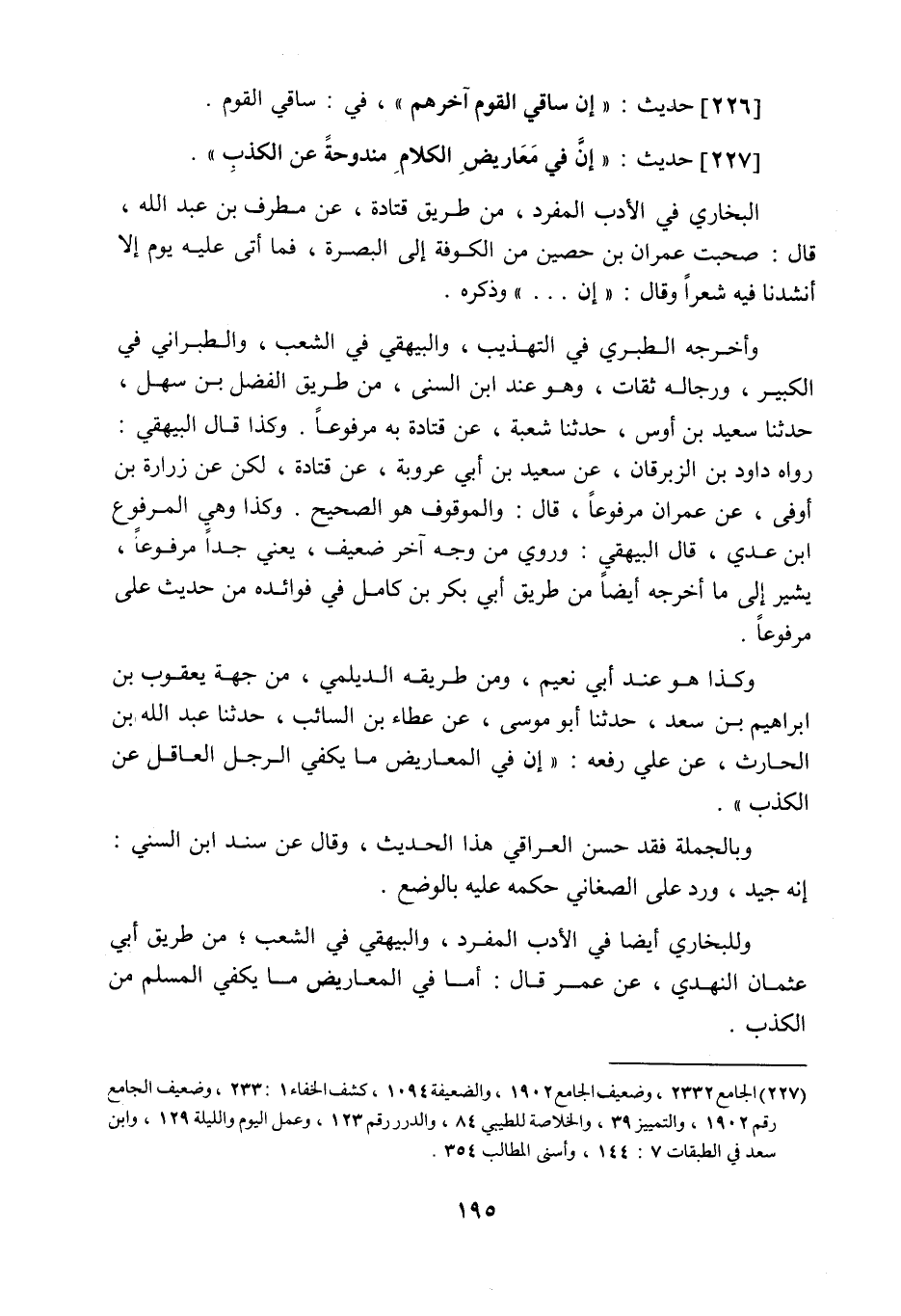 227 - حَدِيث: إِنَّ فِي مَعَارِيضِ الْكَلامِ مَنْدُوحَةً عَنِ الْكَذِبِ، البخاري في الأدب المفرد، من طريق قتادة، عن مطرف بن عبد اللَّه قال: صحبت عمران بن حصين من الكوفة إلى البصرة، فما أتى عليه يوم إلا أنشدنا فيه شعرا وقال: إن، وذكره. وأخرجه الطبري في التهذيب، والبيهقي في الشعب، والطبراني في الكبير، ورجاله ثقات، وهو عند ابن السني من طريق الفضل بن سهل حدثنا سعيد بن أوس حدثنا شعبة عن قتادة به مرفوعا، وكذا قال البيهقي: رواه داود بن الزبرقان عن سعيد عن أبي عروبة، عن قتادة، لكن عن زرارة بن أوفى عن عمران مرفوعا، قال: والموقوف هو الصحيح، وكذا وهى المرفوع ابن عدي، قال البيهقي: وروي من وجه آخر ضعيف، يعني جدا مرفوعا، يشير إلى ما أخرجه أيضا من طريق أبي بكر بن كامل في فوائده من حديث علي مرفوعا، وكذا هو عند أبي نُعيم، ومن طريقه الديلمي، من جهة يعقوب بن إبراهيم بن سعد حدثنا أبو موسى عن عطاء بن السائب حدثنا عبد اللَّه بن الحارث، عن علي رفعه: إن في المعاريض ما يكفي الرجل العاقل عن الكذب، وبالجملة فقد حسن العراقي هذا الحديث، وقال عن سند ابن السني: إنه جيد، ورد على الصغاني حكمه عليه بالوضع (¬1) ، وللبخاري أيضا في الأدب المفرد، والبيهقي في الشعب، من طريق أبي عثمان النهدي، عن عمر، قال: أما في المعاريض ما يكفي المسلم من الكذب،