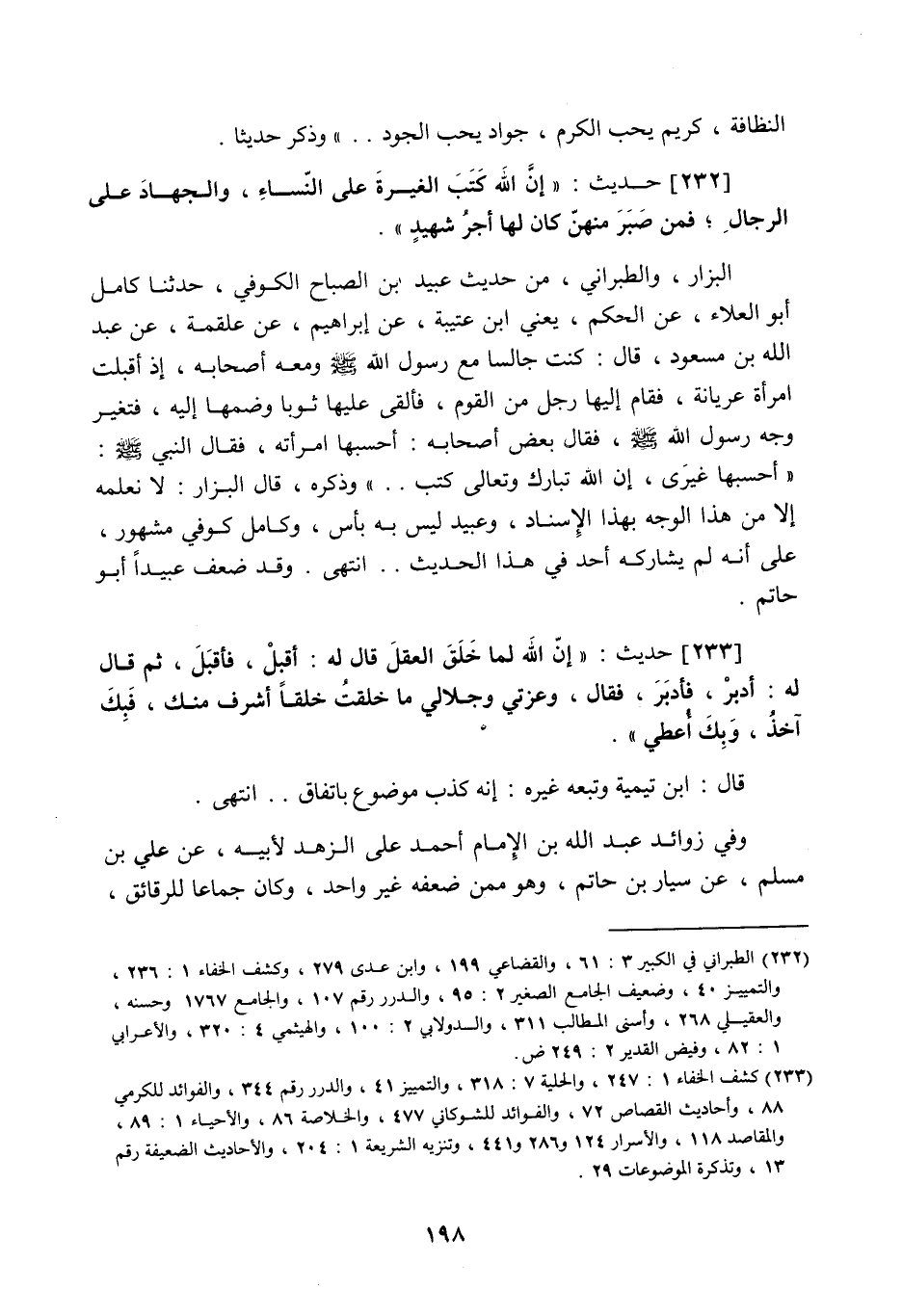 232 - حَدِيث: إِنَّ اللَّه كَتَبَ الْغَيْرَةَ عَلَى النِّسَاءِ، وَالْجِهَادَ عَلَى الرِّجَالِ، فَمَنْ صَبَرَ مِنْهُنَّ كَانَ لَهَا أَجْرُ الشَّهِيدِ، البزار، والطبراني، من حديث عبيد بن الصباح الكوفي حدثنا كامل أبو العلاء عن الحكم يعني ابن عتيبة عن إبراهيم عن علقمة عن عبد اللَّه بن مسعود، قال: كنت جالسا مع رسول اللَّه صَلَّى اللَّهُ عَلَيْهِ وَسَلَّمَ، ومعه أصحابه، إذ أقبلت امرأة عريانة، فقام إليها رجل من القوم، فألقى عليها ثوبا وضمها إليه، فتغير وجه رسول اللَّه صَلَّى اللَّهُ عَلَيْهِ وَسَلَّمَ، فقال بعض أصحابه: أحسبها امرأته، فقال النبي صَلَّى اللَّهُ عَلَيْهِ وَسَلَّمَ: أحسبها غيرَى، إن اللَّه تبارك وتعالى كتب، وذكره، قال البزار: لا نعلمه إلا من هذا الوجه بهذا الإسناد، وعبيد ليس به بأس، وكامل كوفي مشهور، على أنه لم يشاركه أحد في هذا الحديث انتهى، وقد ضعف عبيدا أبو حاتم.